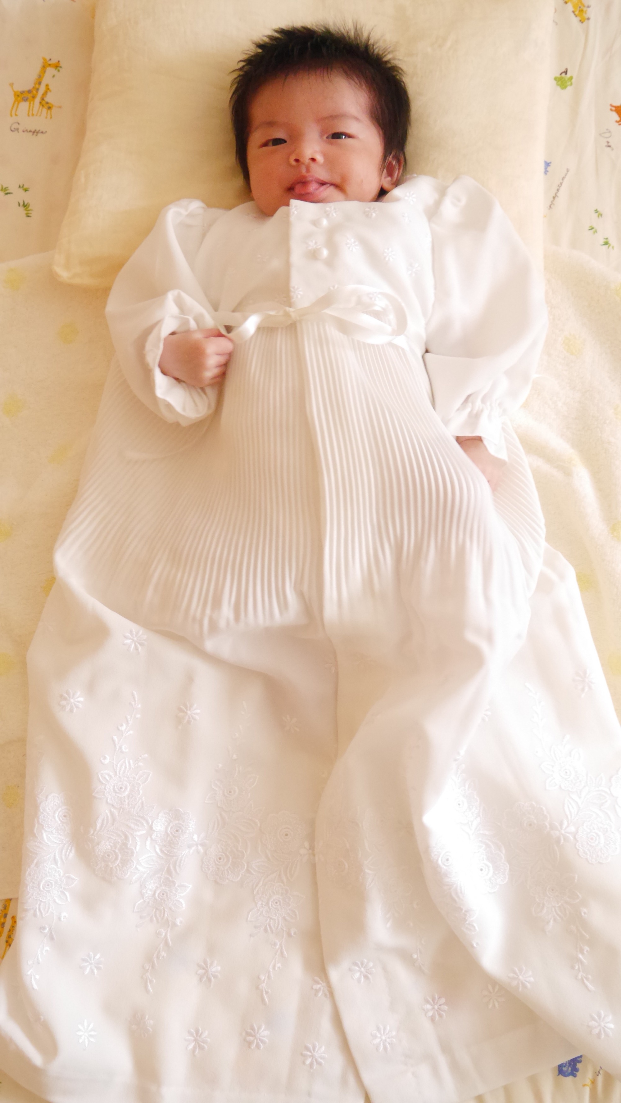 この産着(うぶぎ)もママがお宮参りに行ったときに使ったものだそうです。ママは覚えていませんが(笑)