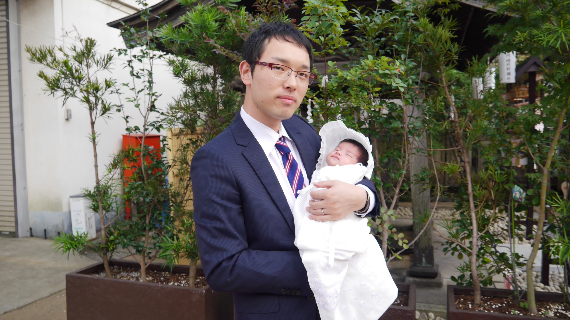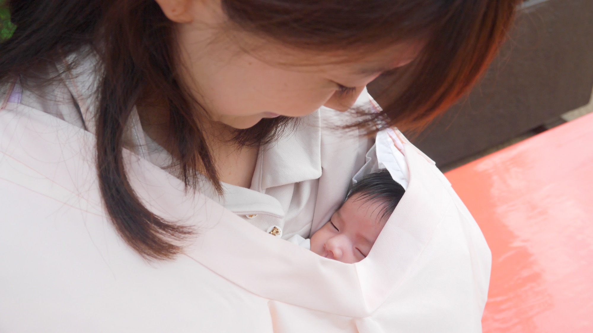 おめかしして溝の口神社というところにお宮参りに行ってきます。めいさんが着ているセレモニードレスは、なんとママが33年前、お宮参りのときに着たものです。