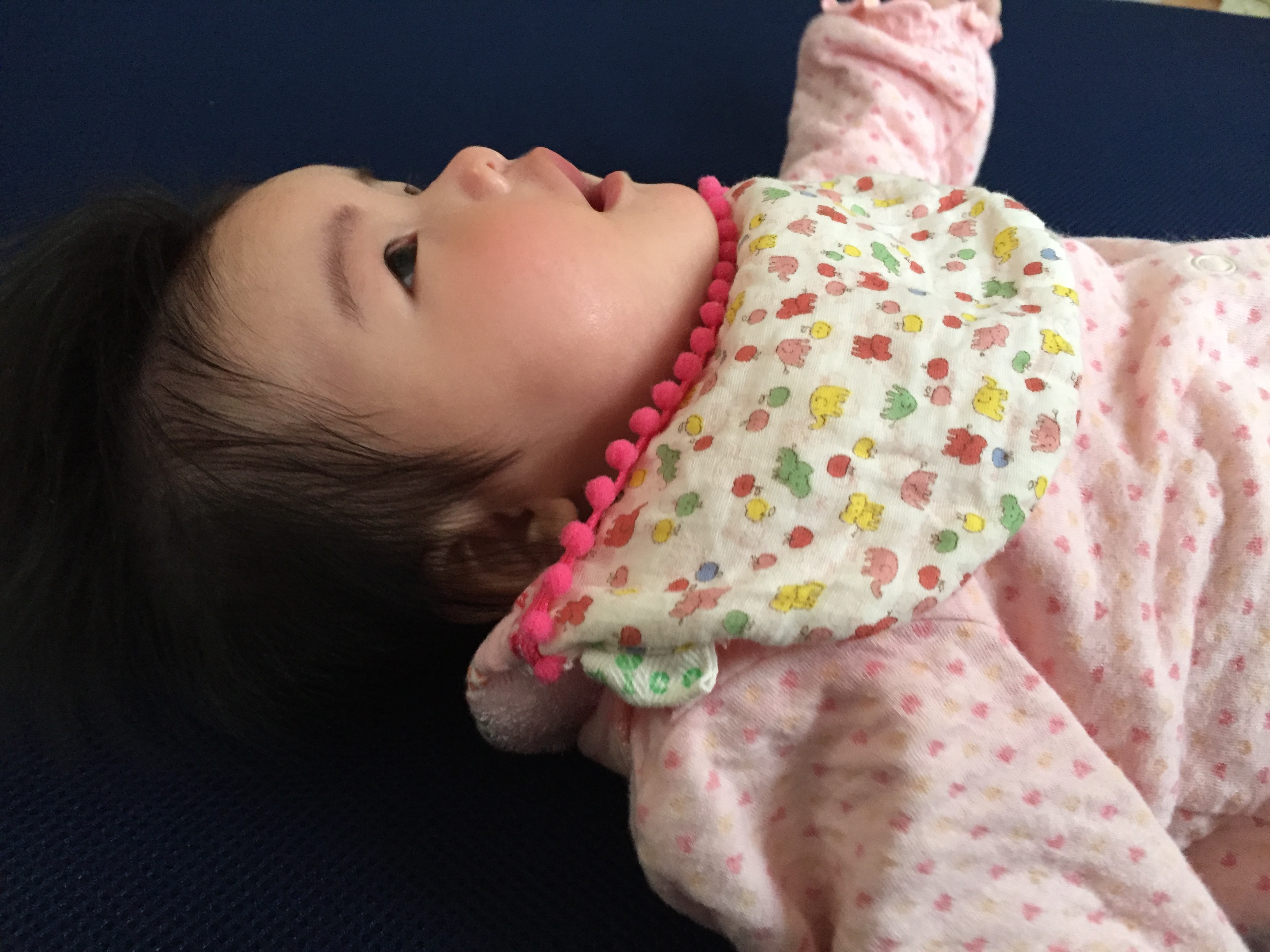 朝、手足をバタバタさせて遊んでいるめいさん。