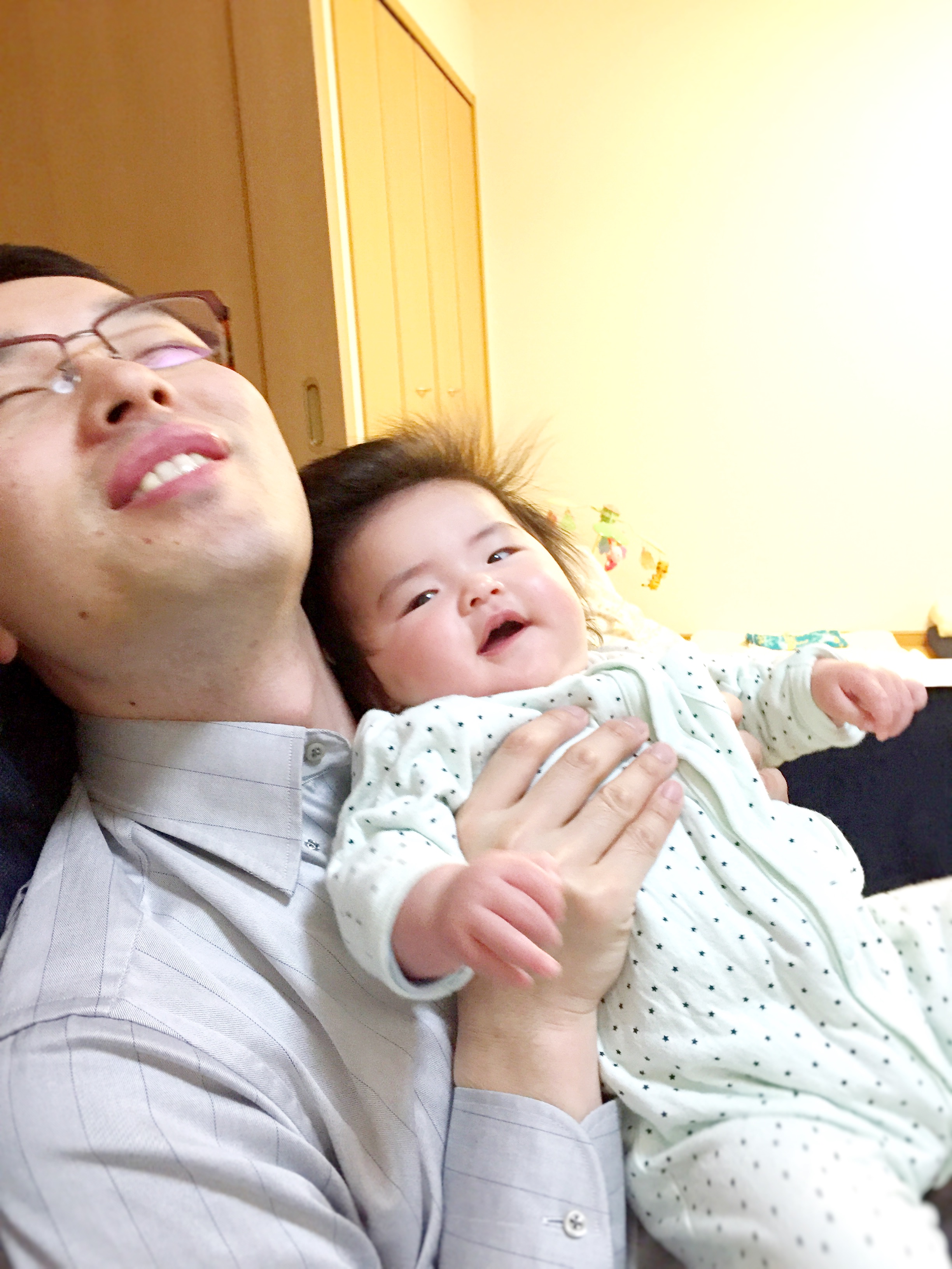 お風呂の後、パパとリラックスタイム。キャッキャはしゃいでいます。