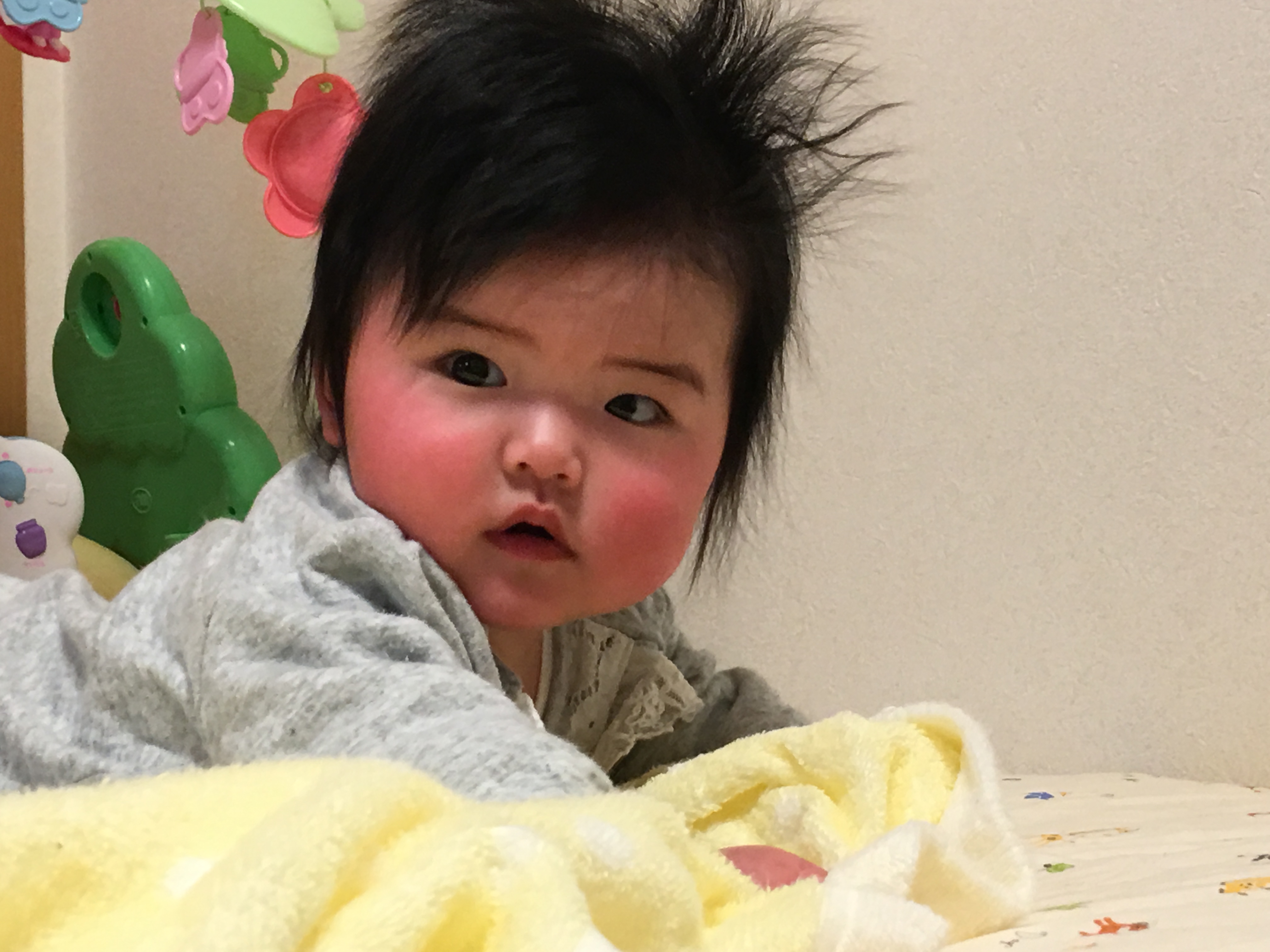 寝返りをしてうつぶせになって苦しそうにしてるところを仰向けにしてあげると、またすぐに寝返りをして泣きだす、の繰り返しです。泣きながら必死に練習をする姿はまさに卓球の福原愛ちゃんみたいです。