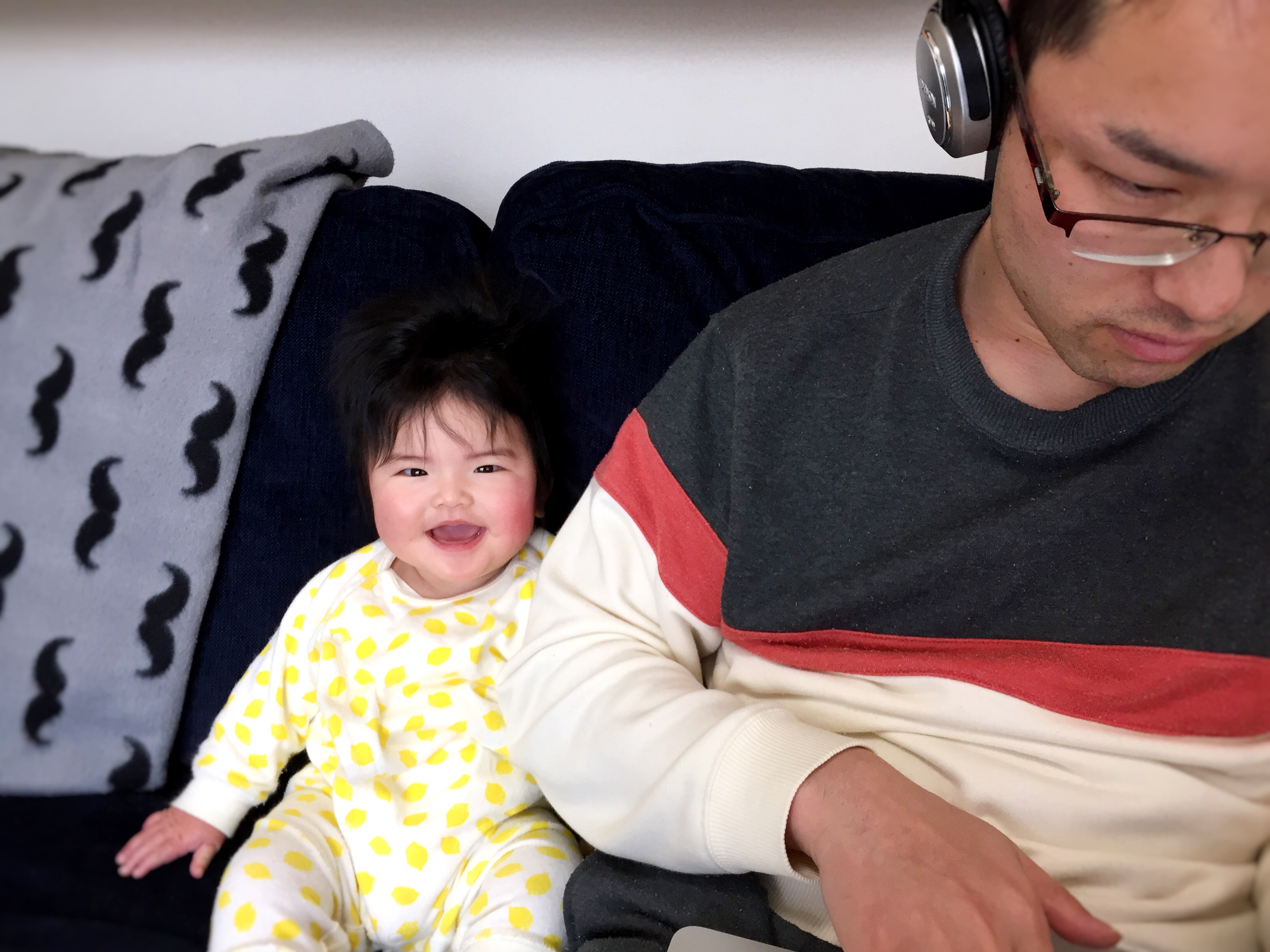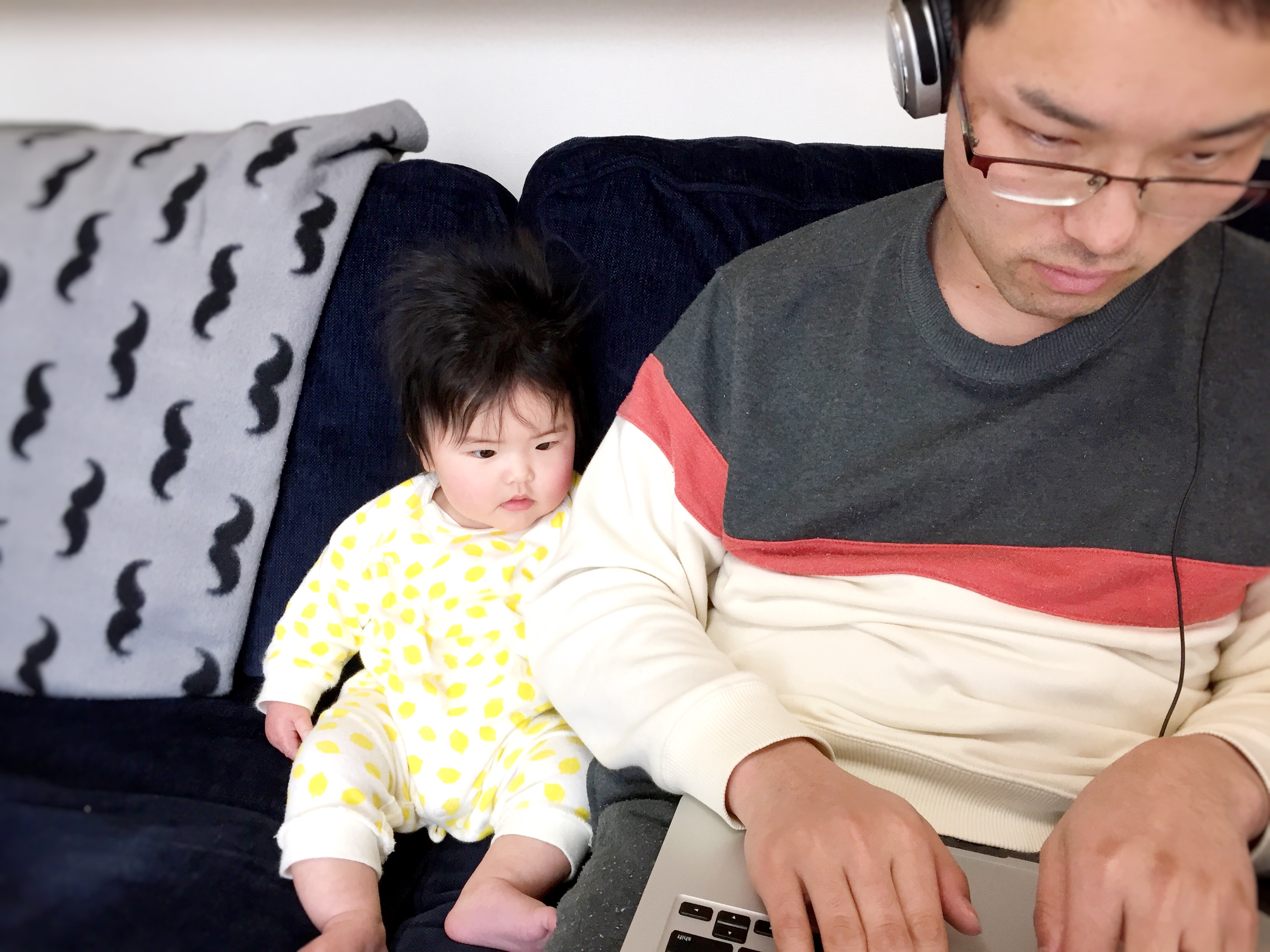 パパがパソコンをしているのを興味深そうに眺めています。