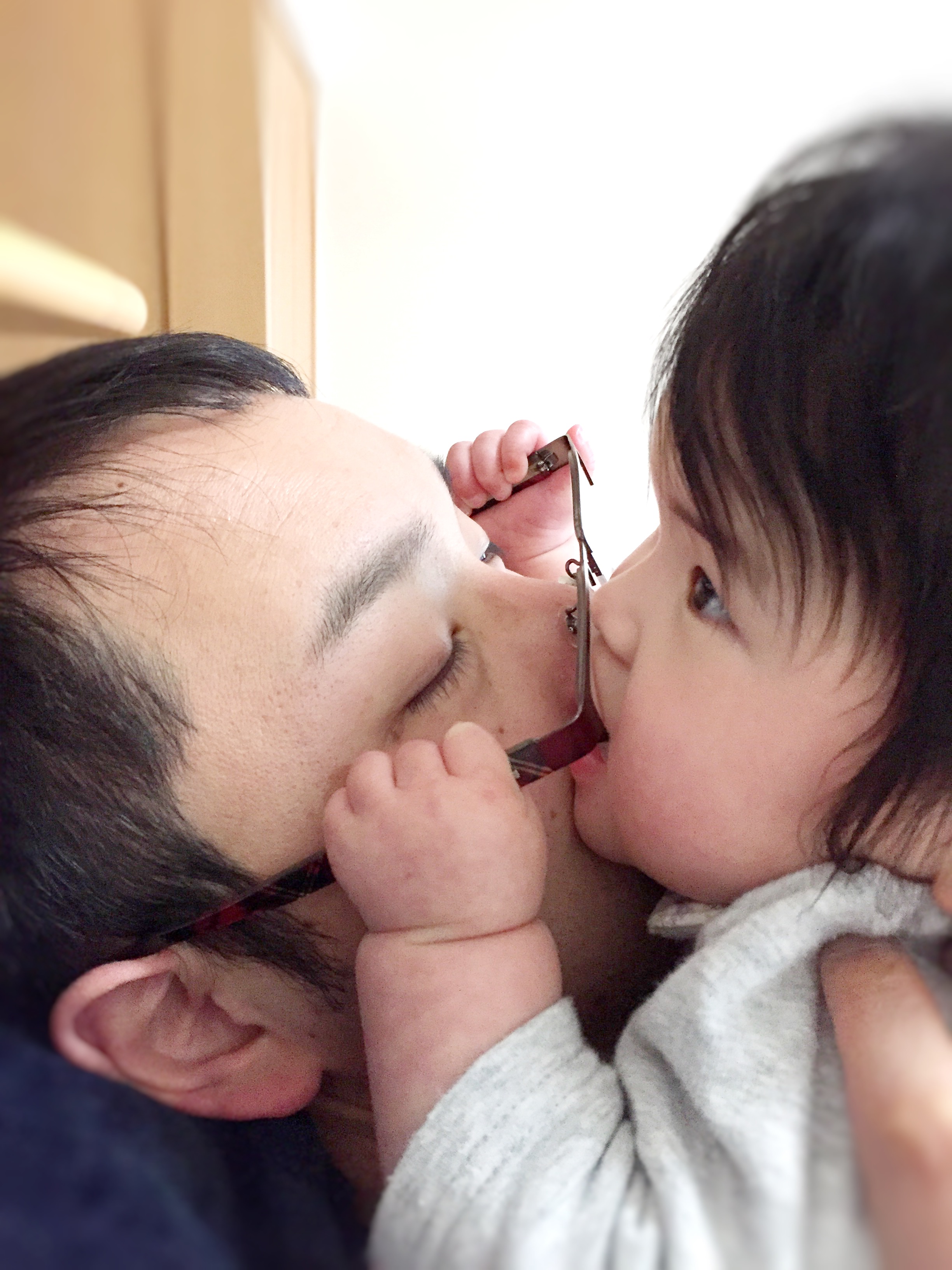 最近何でもつかむのが好きなめいさん。今日はパパのメガネを取ってペロペロ。