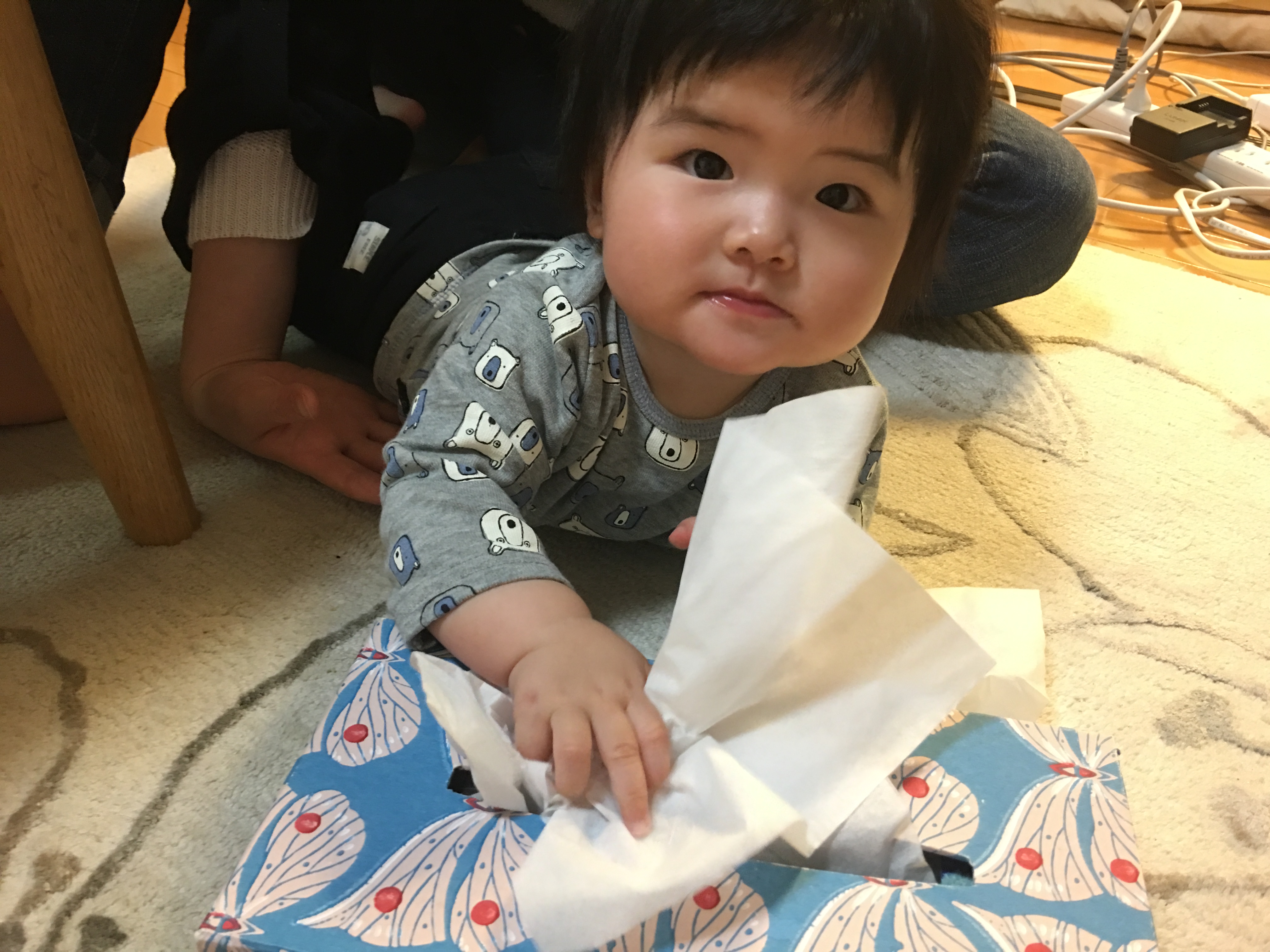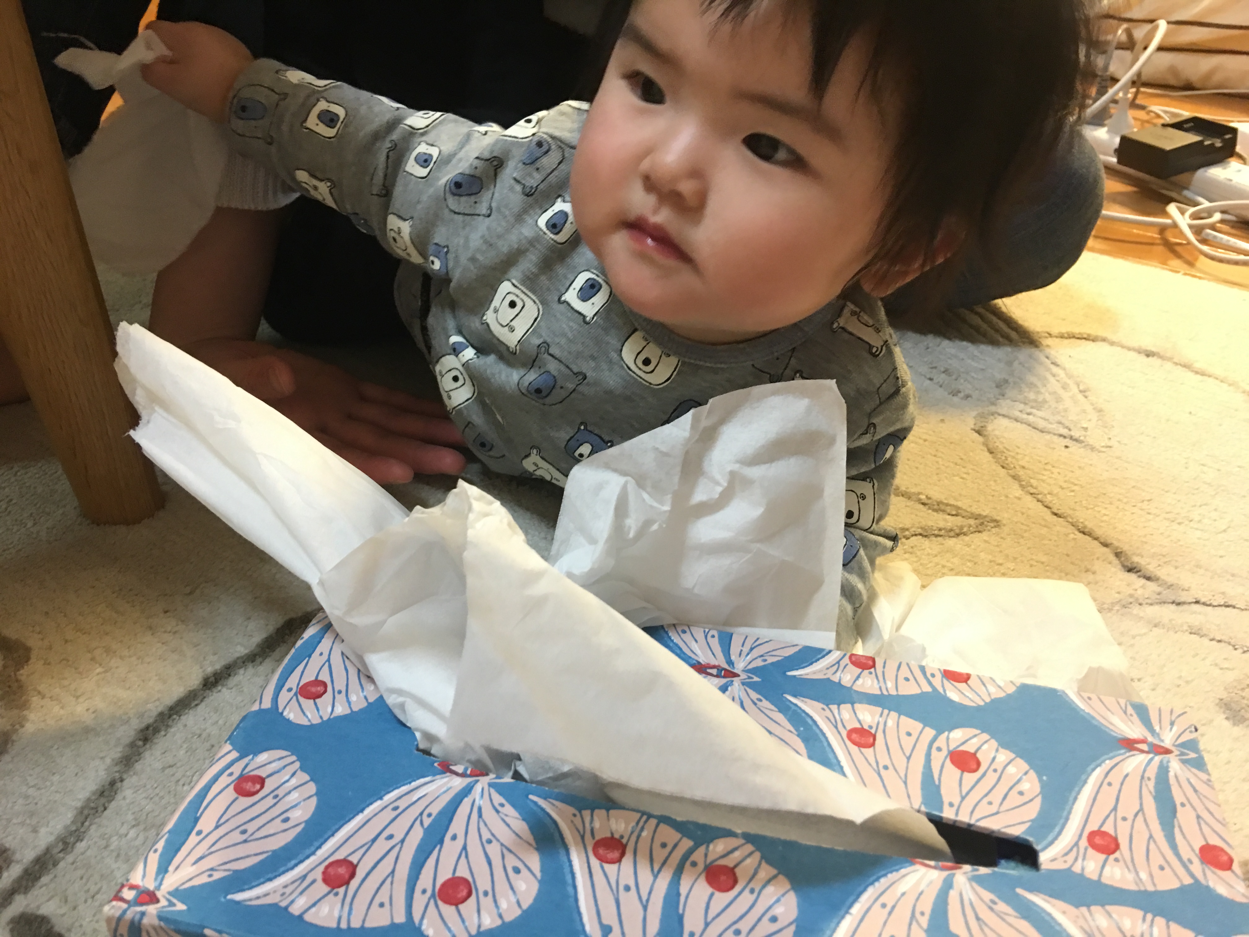 赤ちゃんはティッシュ遊びが好きと聞いていましたが、めいさんもとうとうティッシュを箱から取り出すことを覚えました。
