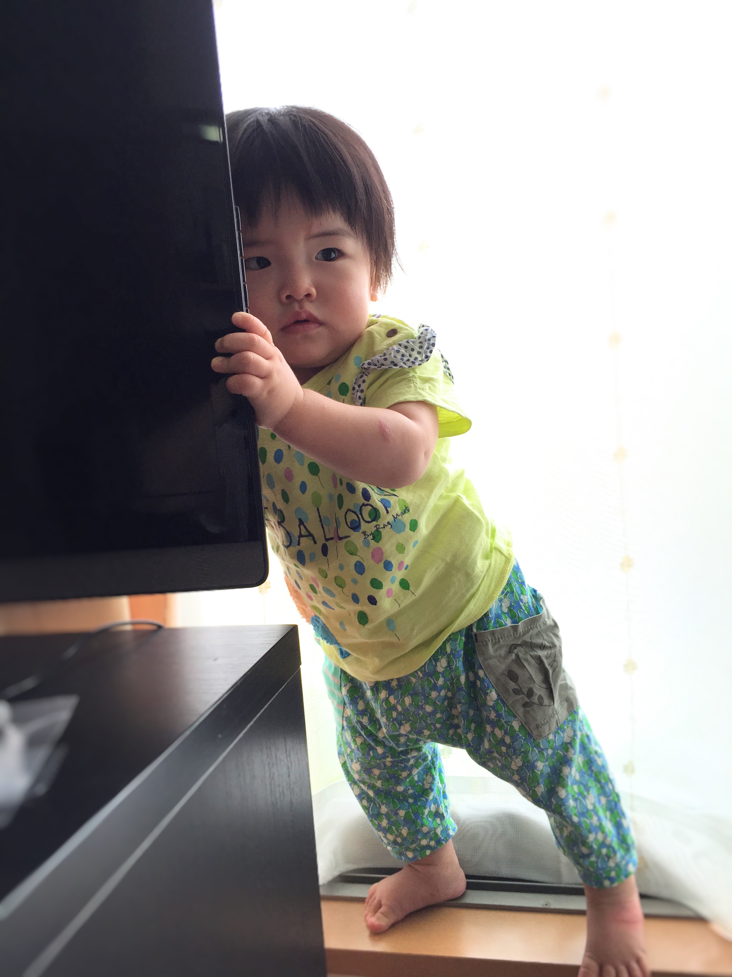 つたい歩きが上手になってきためいさん。今日はパパの足を使って歩く練習です。