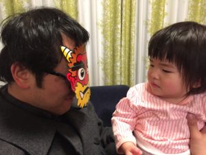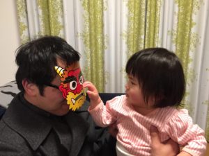 節分。 めいさん日記 2017.02.05 2/3(金)の夜、おうちに鬼さんがやってきました。ちょっとおっかなびっくり。 おそるおそる・・・。 『あっ、パパだぁー!』 めいさんが保育園で作った鬼さん。 コメント