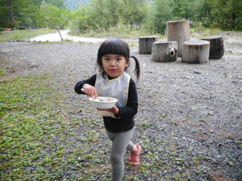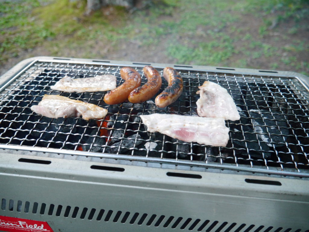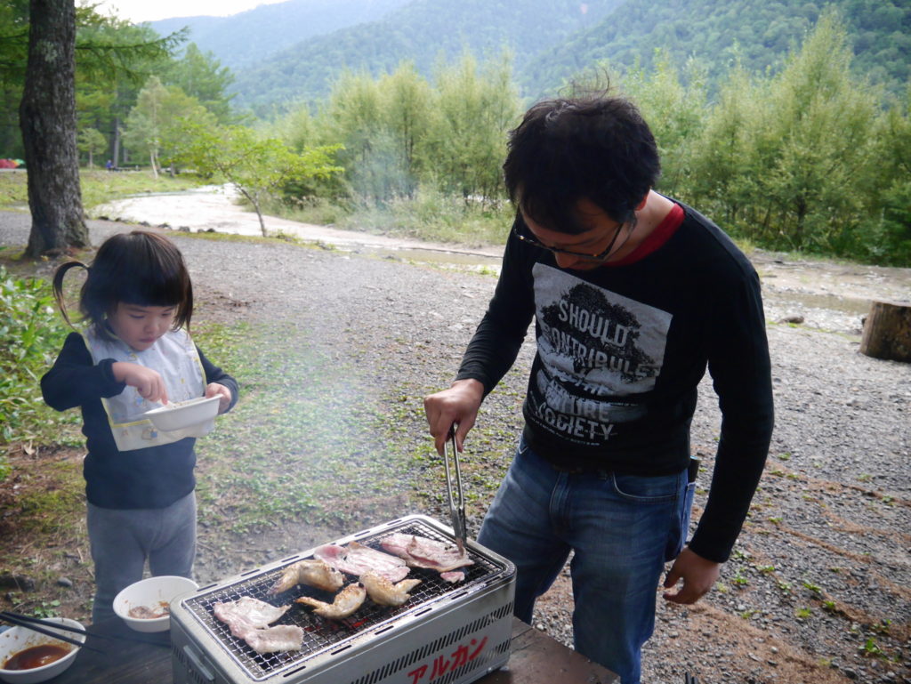 こうちゃん家族サービス中。火を起こして炭でお肉を焼いてます。めいさんは食べる専門です。