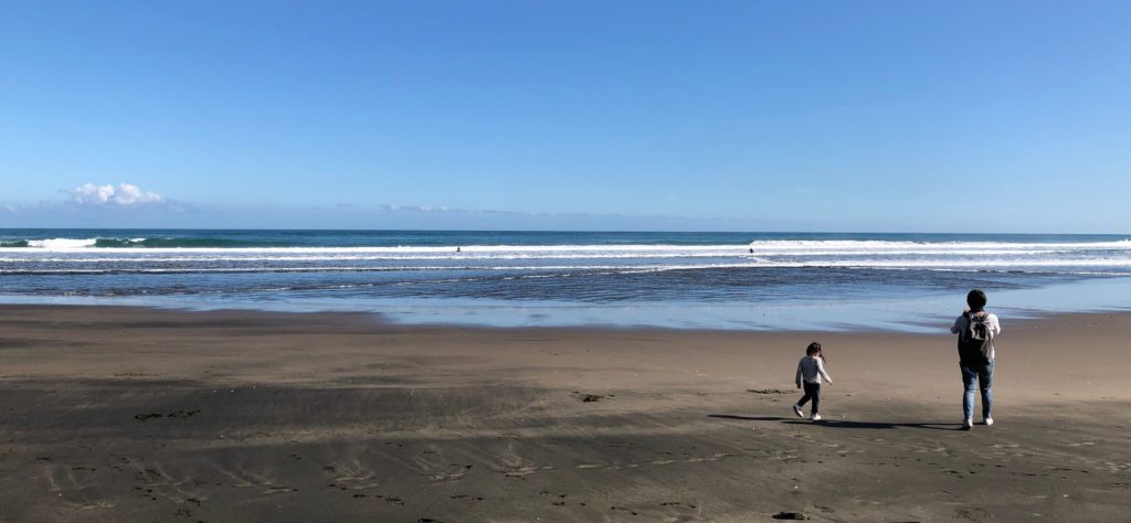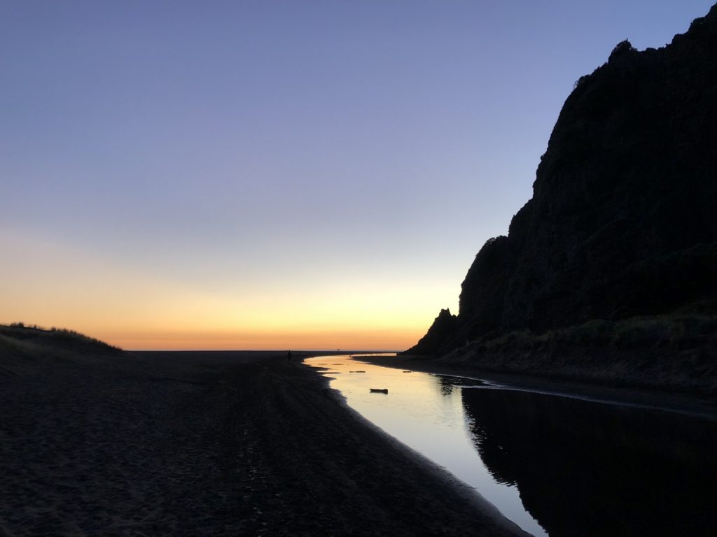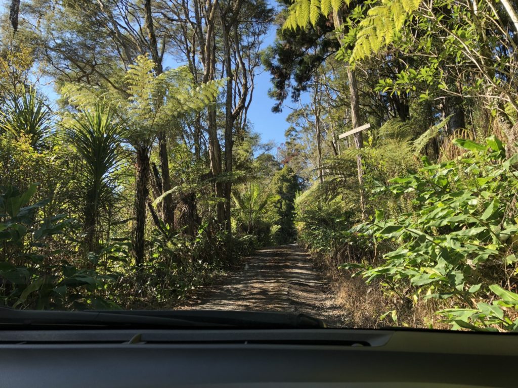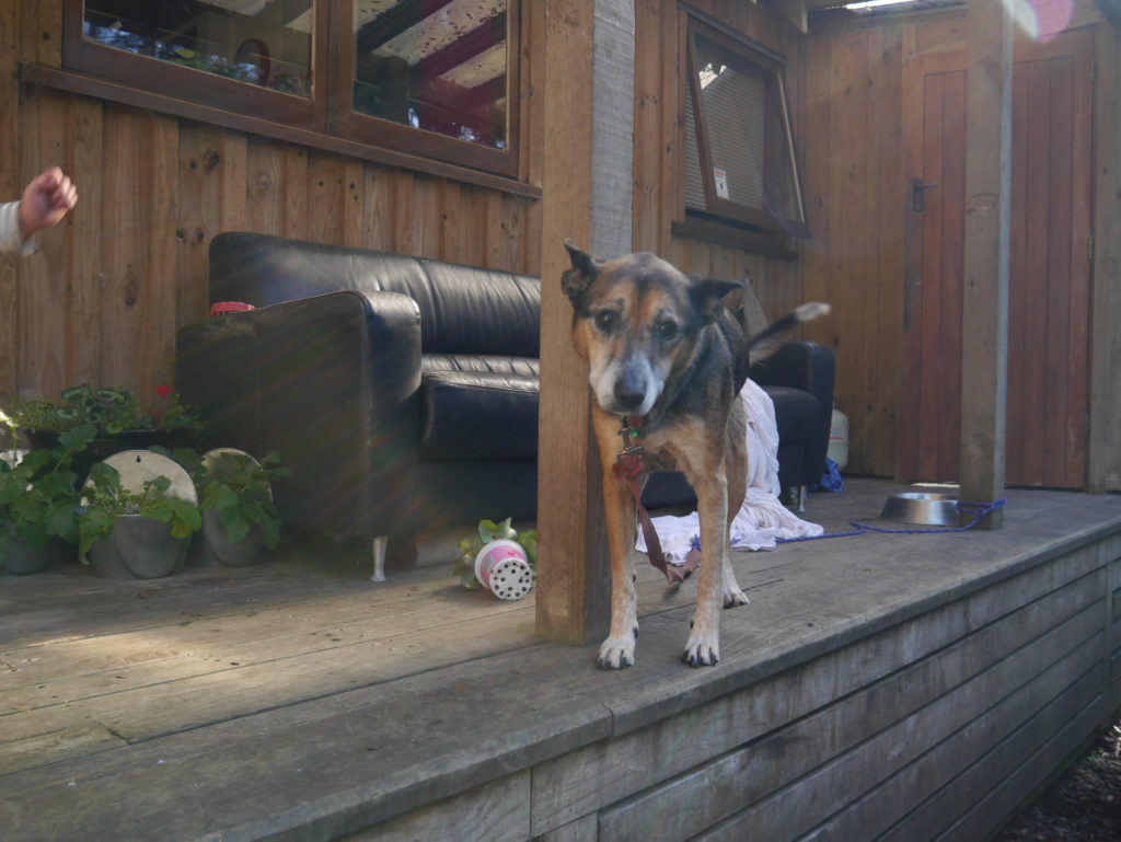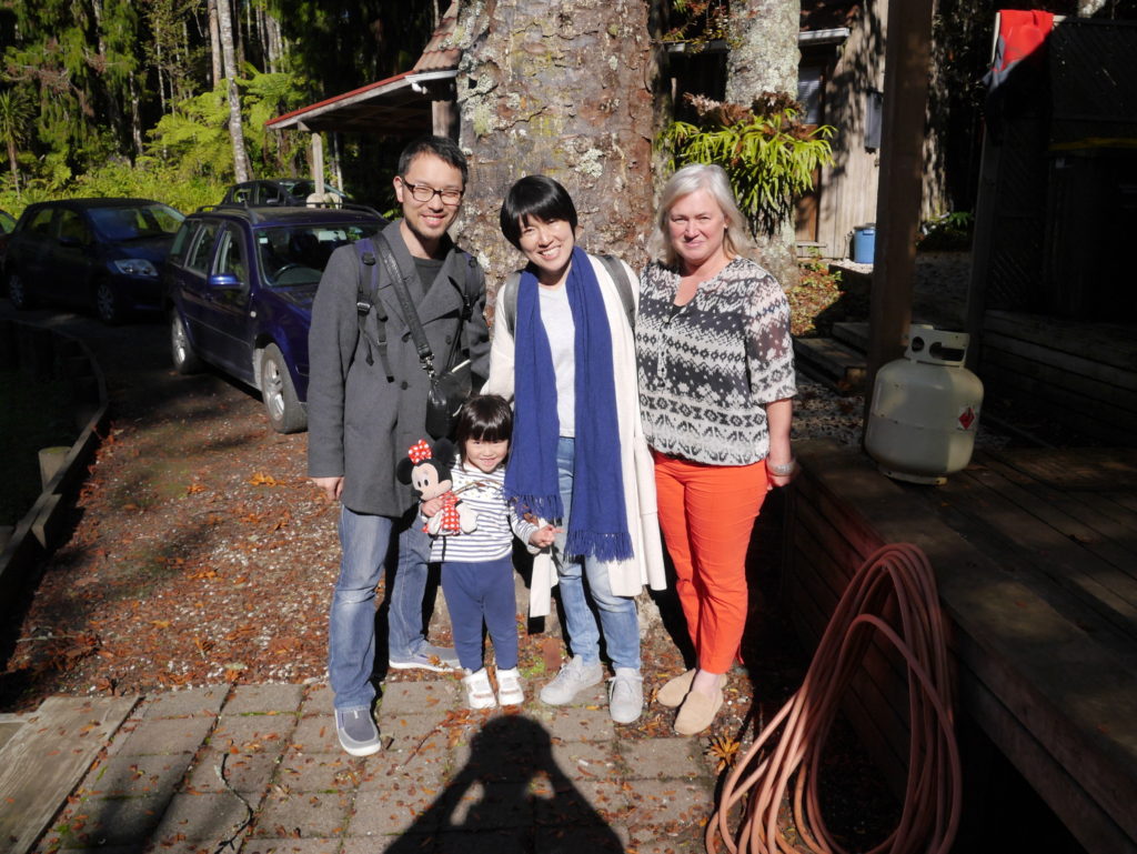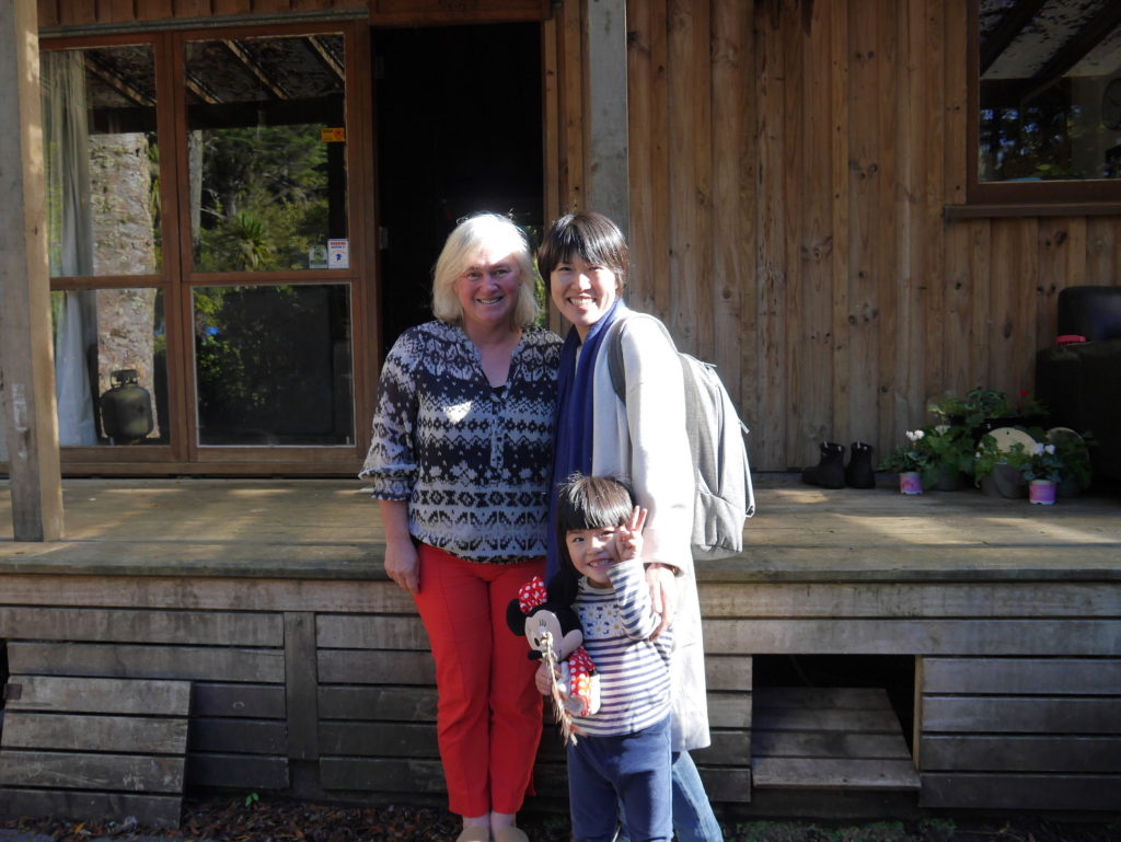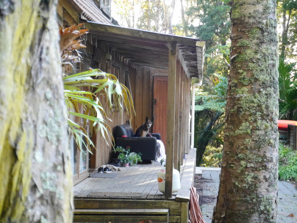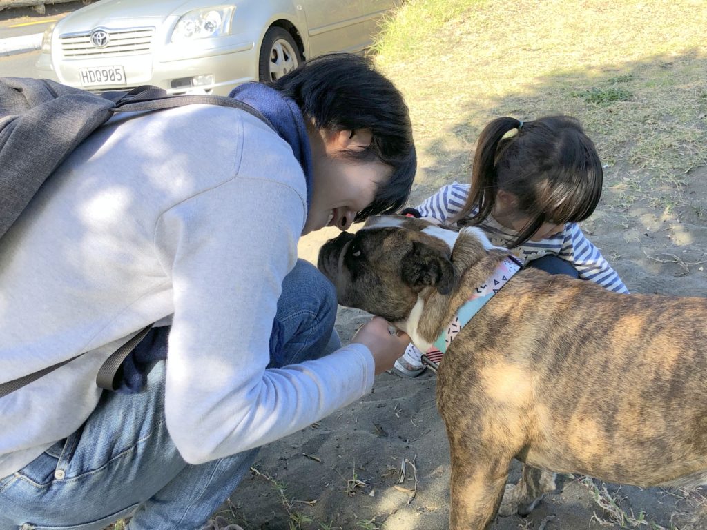 Sunrise Photo by Yoko (Kosuke and Mei were sleeping.)コテージのリビング。朝食。隣に住んでいるオーナーさんのワンワンがソファに座ってこっちを向いている。かわいい。めいさん恐る恐る近づく。Hello?オーナーの Elke さん。写真ではまぶしくて少ししかめっ面に見えますが、とっても優しい方でした。コテージから公道へ出るために原生林に囲まれたこの狭い道を進みます。Piha Beach へ向かう道中での絶景。ビーチの駐車場の近くに人懐こいワンワンがいました。Piha Beach 到着。きれいな海。波が激しくサーファーがたくさんいました。