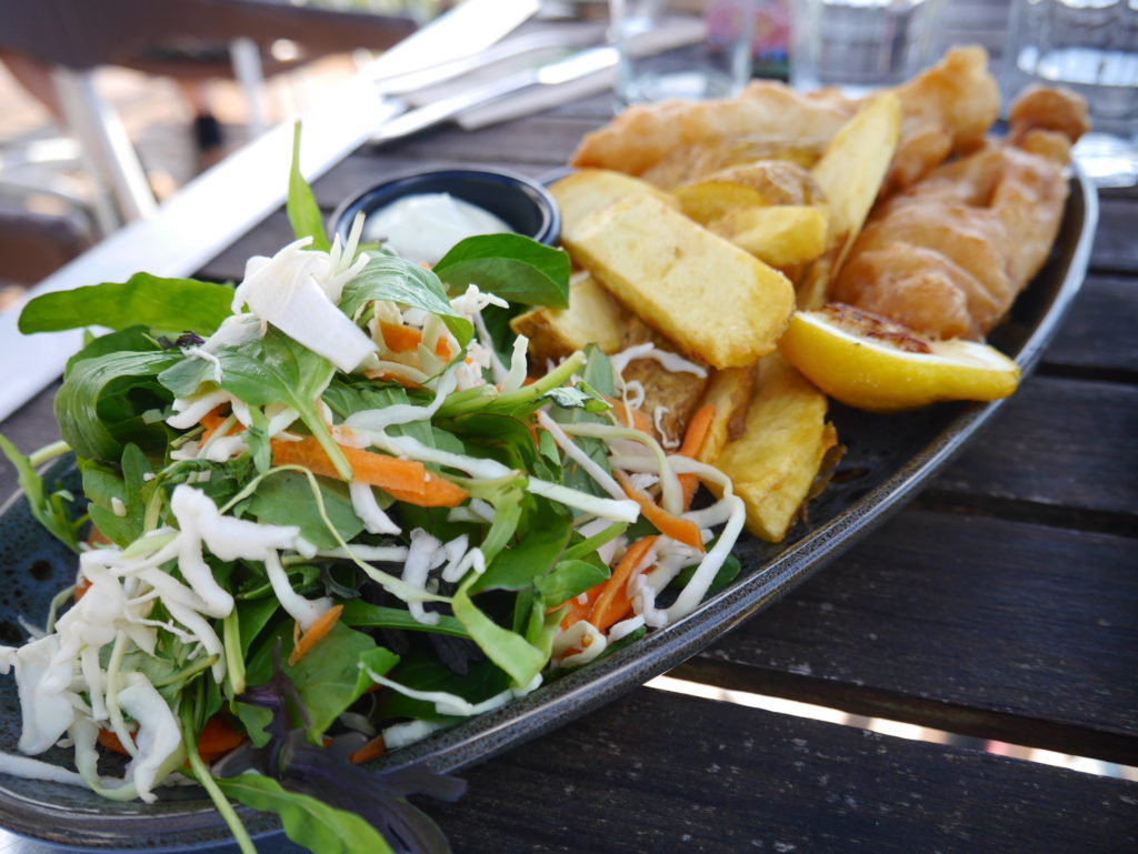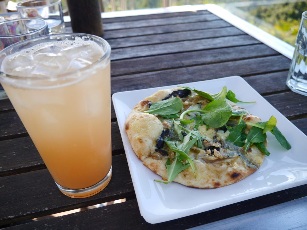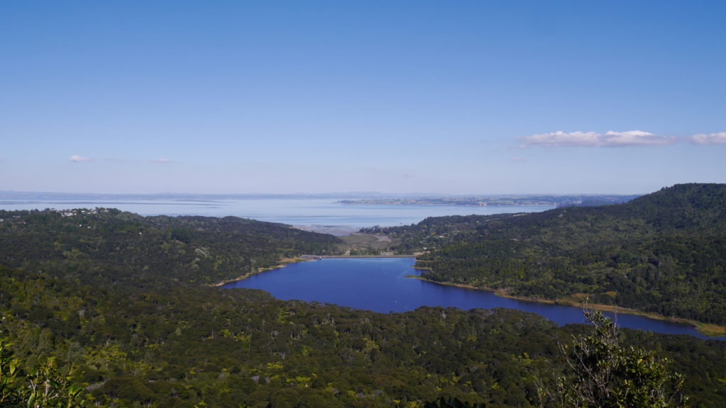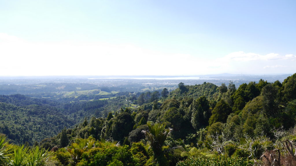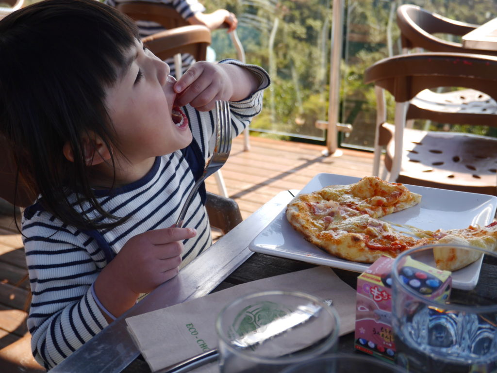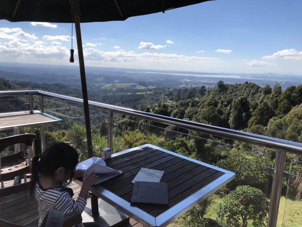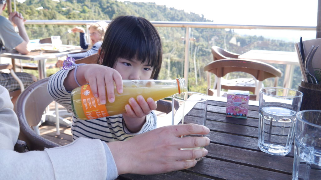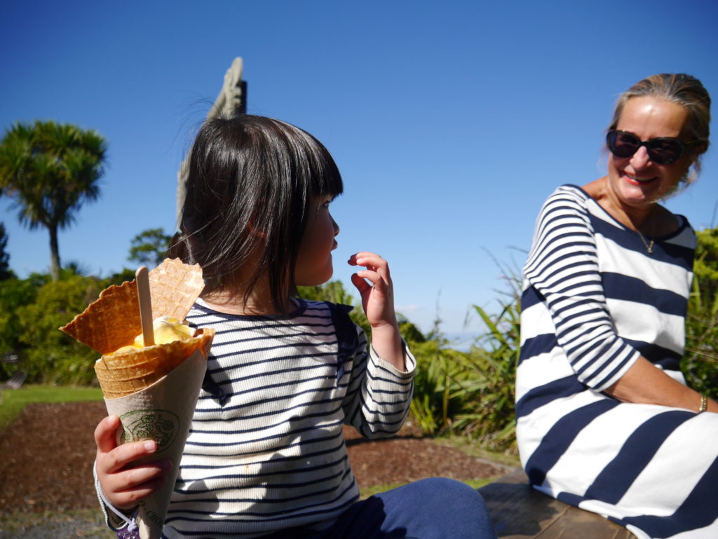 めいさんは波にのまれてずぶ濡れに。急遽こうちゃんのTシャツにお着替え。こうちゃんは現地の人のようにワイルドな感じになりました。一旦コテージに戻りシャワーを浴びてから景色が素晴らしいレストラン(Elevation)にやってきました。 テラス席が気持ちいい。ジュースがぶ飲み。ようこちゃんにジュースをついでいます。こうちゃんは Kaurilands (Balsamic reduction, garlic, rosemary and marscapone base, smoked mushrooms, caramelised onions, blue cheese, walnuts) というピザ。ようこちゃんは Fish and Chipsミニーちゃんも絶景を満喫しました。Arataki Visitor Centre というところに行ってきました。めいさんはアイスクリーム屋さんを見つけて早速いただいています。アイスクリーム屋で働いていたお嬢さんのお母さんと仲良しになりました。