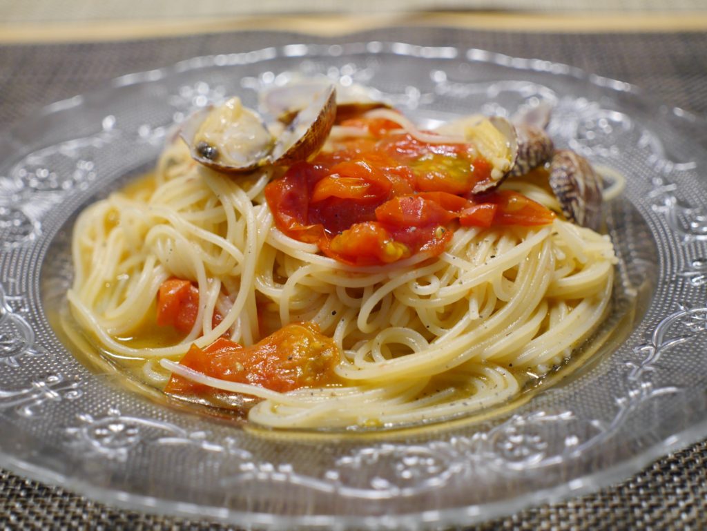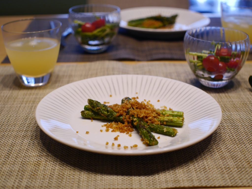 前菜はアスパラガスのパン粉焼きとルッコラとトマトのサラダ。