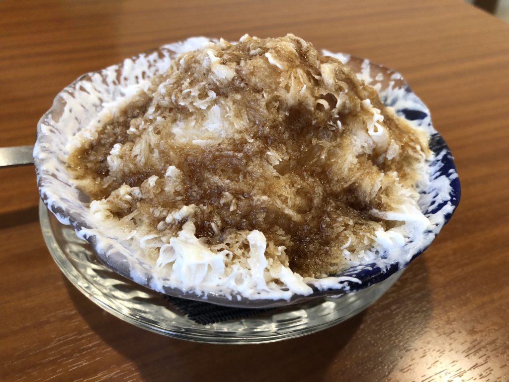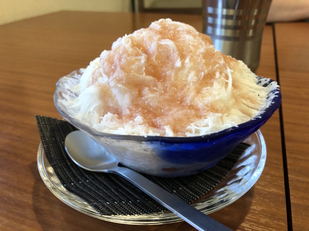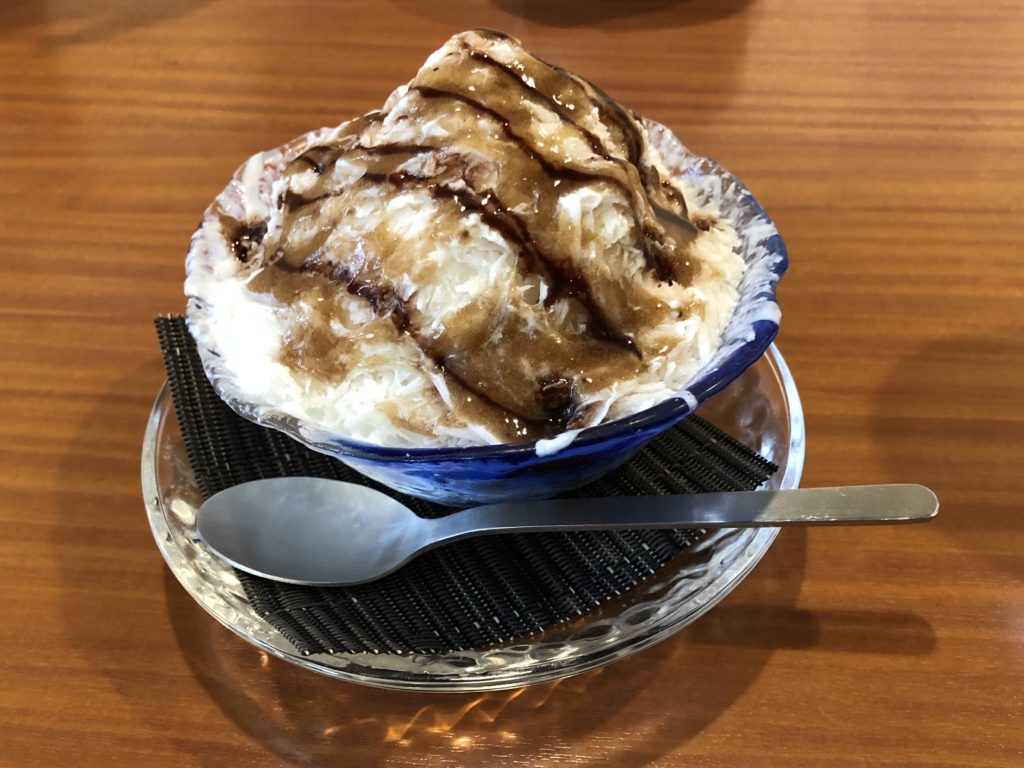 私はカフェオレ。氷は牛乳で作られていて、シロップも手作りです。甘すぎず、美味しいかき氷でした。