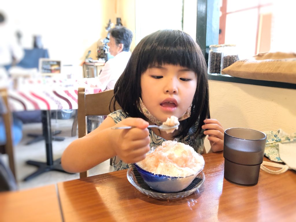今日は暑かったので、3人でシモト珈琲という近所のお気に入りのお店にかき氷を食べに行きました。めいさんはいちごミルク。