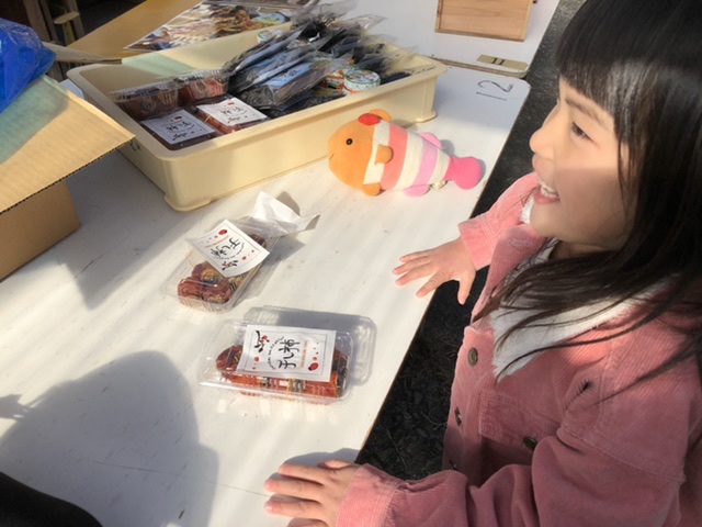 仲良くさせていただいているご近所の干物屋さんもお店を出されているので、まずはご挨拶に行ってきました。手作り干し柿のパッケージを貼るお手伝いを少ししてきました。