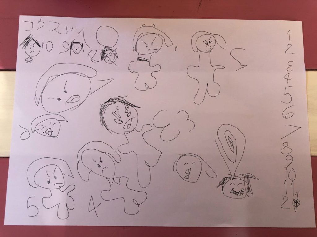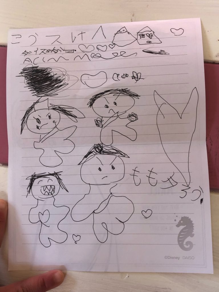 最近はめいさんからこうちゃんへお手紙が毎日数10枚届きます。今日は桃太郎と犬と猿が鬼を退治する絵を描いた手紙です(12:23)。毎日ひらがなもカタカナも絵もメキメキ腕を上げています。絵からは桃太郎たちの力強さが伝わってきます。