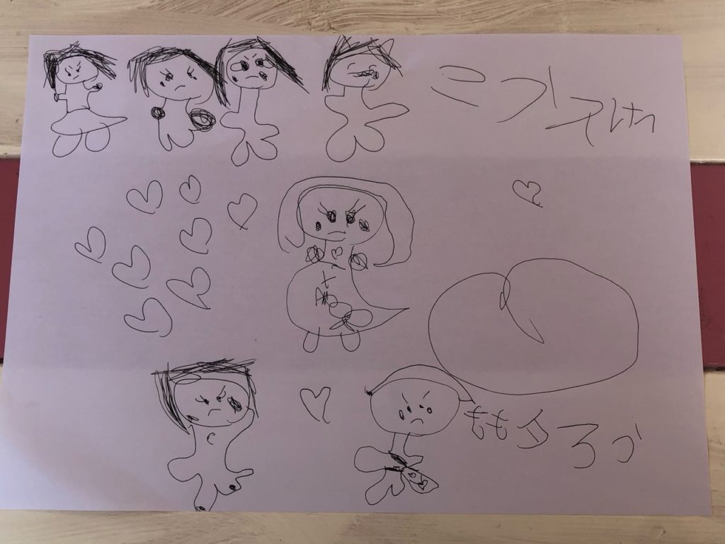 数字が割り振られているようです(意味はないですが)。1から6までいます。2はおんなのこ。6はねこむすめ。1の上にいる子は右上にいる鬼に最初殺されかけていましたが、ギリギリみんなの力で助かったとのことです。想像力がすごい。