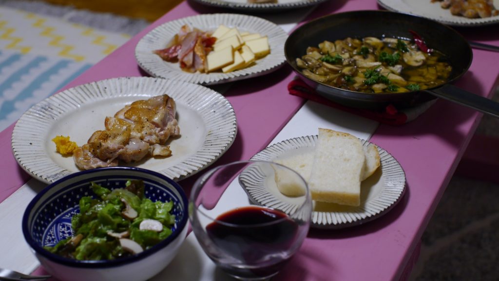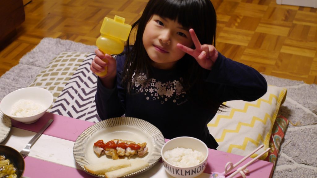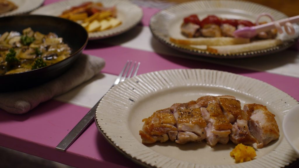 クリスマスイヴディナー。メインは鶏もも肉のソテー自家製柚子胡椒添え。めいさんはトマトソースをトッピング。