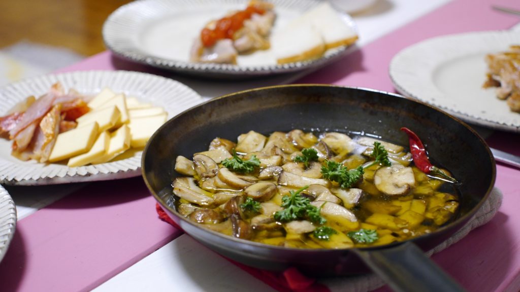 キノコのアヒージョに自家製のパンを添えて。新婚旅行で行ったスペインの味を思い出しました。