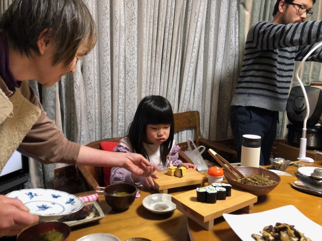 めいさん、まずはかんぴょう巻きをいただきました。お行儀が悪すぎ(笑)。