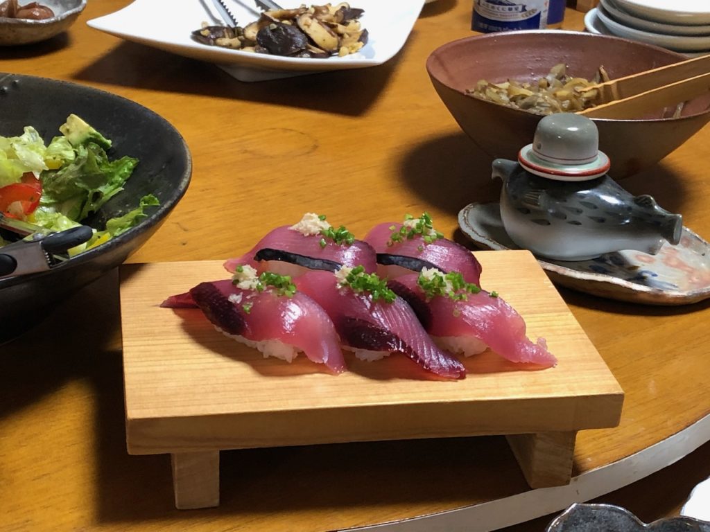 ほうえいのご主人が刺身を切って巻物やにぎり寿司を振る舞ってくれました。ちなみに、お寿司を乗せる寿司下駄や、刺身を格納している箱などはすべてご主人の手作りです。