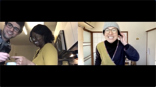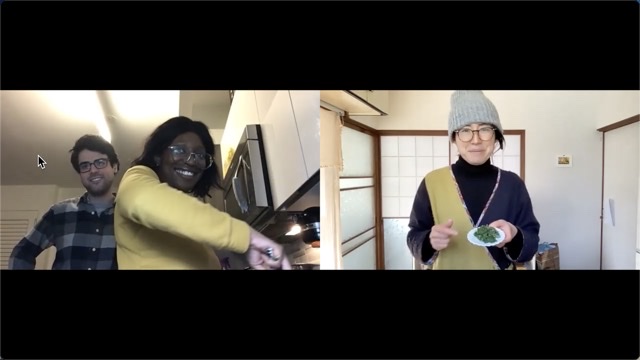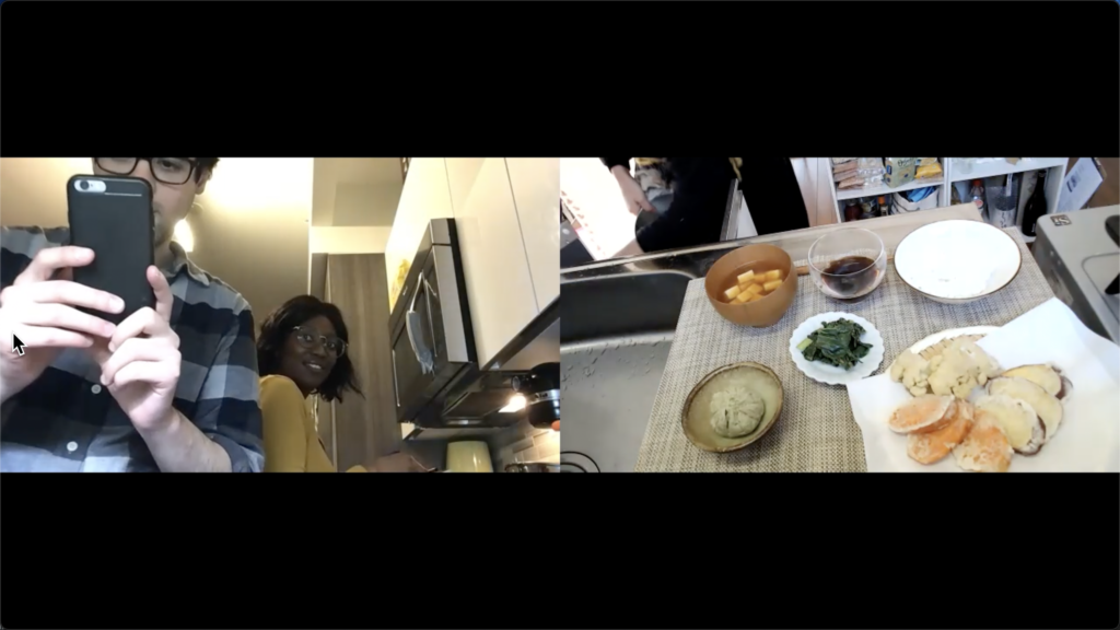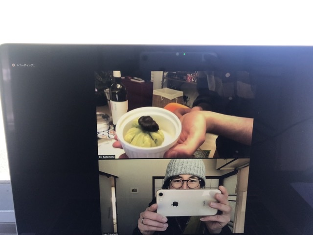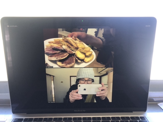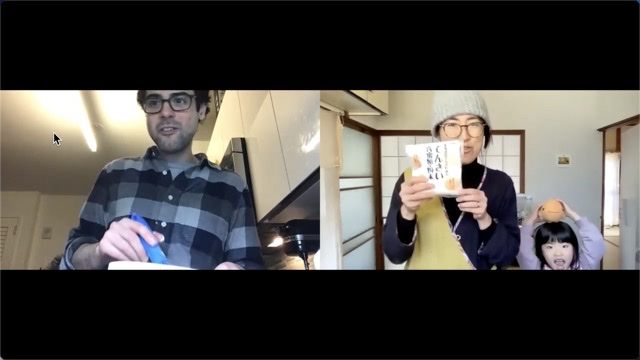 今日もめいさんは私の職場見学をしに来ました。朝はアメリカの方とオンライン料理教室です。元気にはじまりのご挨拶をしていました。