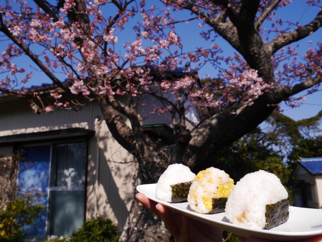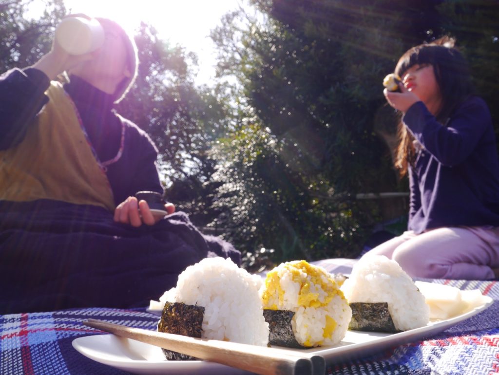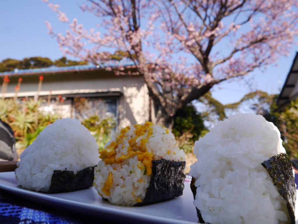 自家製梅干し、自家製の柚子胡椒入りのおにぎりと、手作りのりたまのおにぎり。