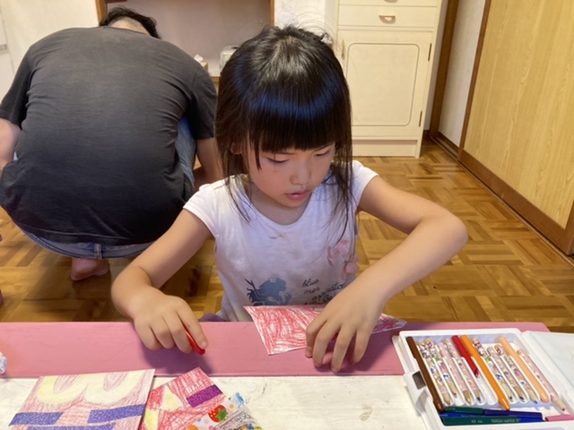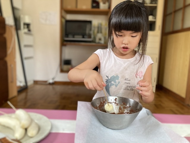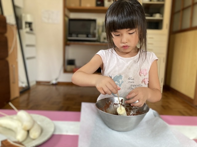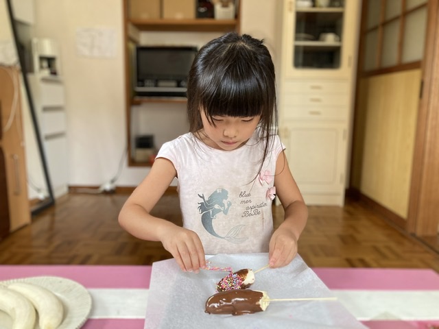 今日はめいさんが待ちに待ったおうち夏祭り。午前はママと一緒に夏祭りに必要な食材やおやつを買いにスーパーへ。午後は一緒にチョコバナナを作ったり、マックフライポテトの袋を作ったりしました。