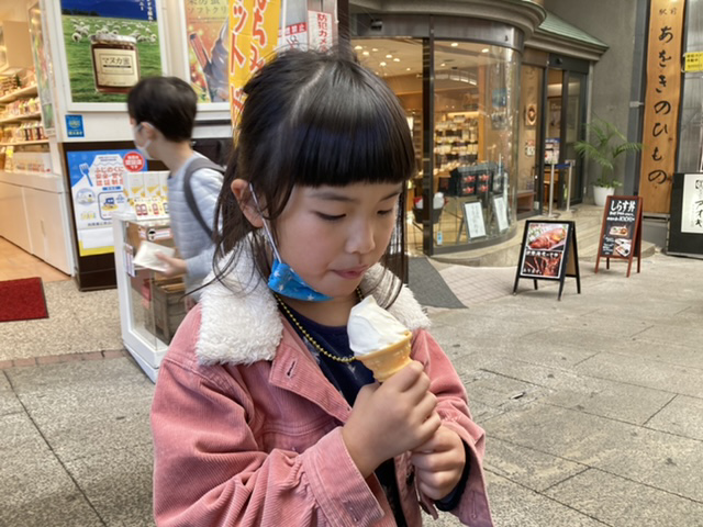 大家さんがめいさんがソフトクリームが大好物なのを覚えてくださっていてソフトクリーム屋さんに案内して下さいました。私も一口めいさんからもらいましたが、蜂蜜入りの美味しいソフトクリームでした。