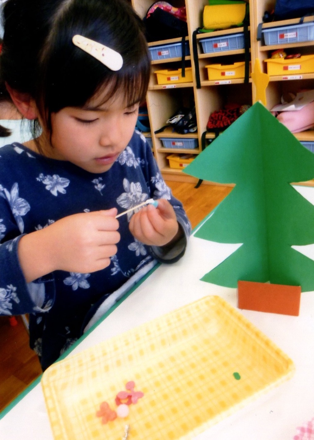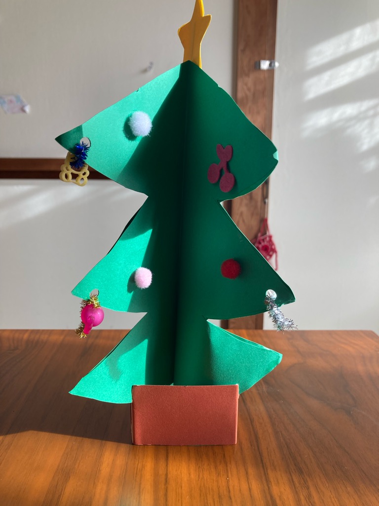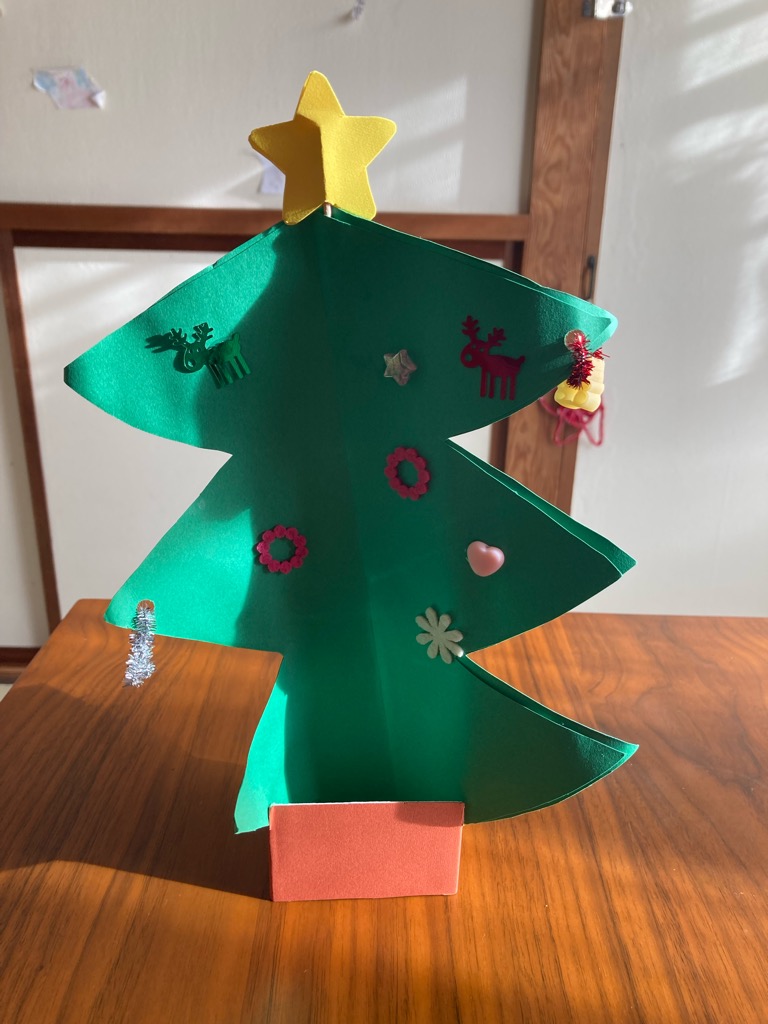 クリスマスツリー めいさん日記 2021.12.18 幼稚園で可愛らしいクリスマスツリーを作ってきました。ツリーは線に沿って自分ではさみで切り、好きな飾りをつけたそうです。 制作している様子。真剣な表情です。 コメント