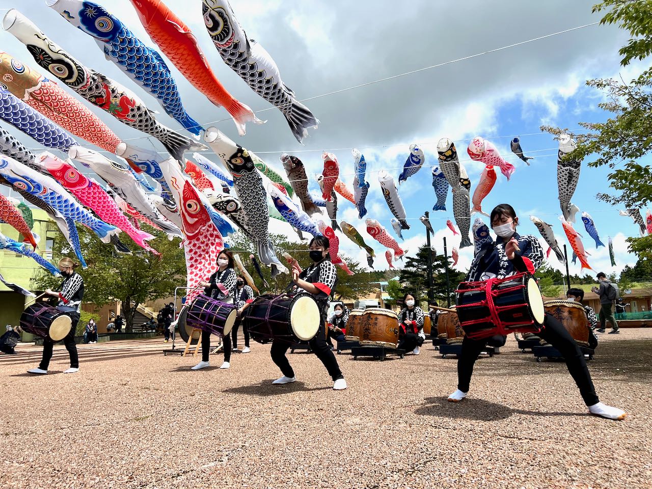 鯉のぼりの下でお姉さんたちが迫力のある演奏をめいさんも楽しんでいました。