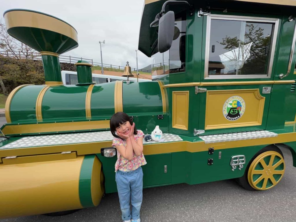 全部歩いて移動したので結局乗らなかったけど、園内を周回する電車の前で写真。