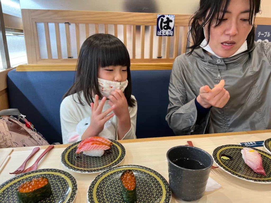 もっと早く帰って納豆ご飯を食べる予定だったのですが、思いのほか閉園ギリギリまで満喫して、晩ごはんどうするかと話していたところ、めいさんは「レストランみたいなところに行きたい」と言ったので、急遽お寿司を食べることにしました。