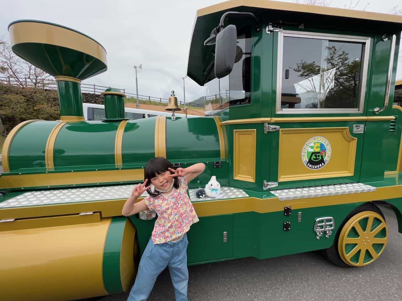 全部歩いて移動したので結局乗らなかったけど、園内を周回する電車の前で写真。