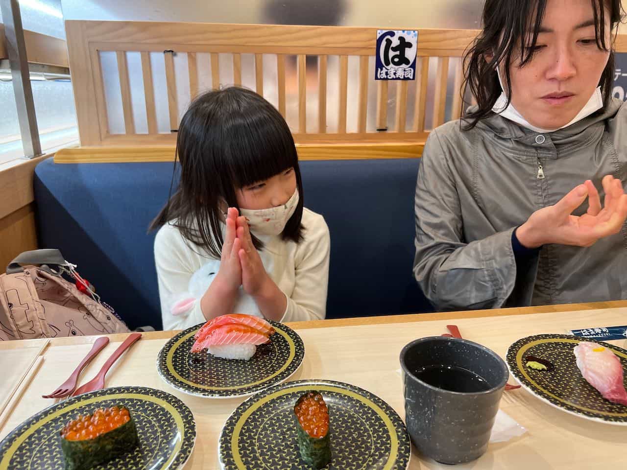 もっと早く帰って納豆ご飯を食べる予定だったのですが、思いのほか閉園ギリギリまで満喫して、晩ごはんどうするかと話していたところ、めいさんは「レストランみたいなところに行きたい」と言ったので、急遽お寿司を食べることにしました。