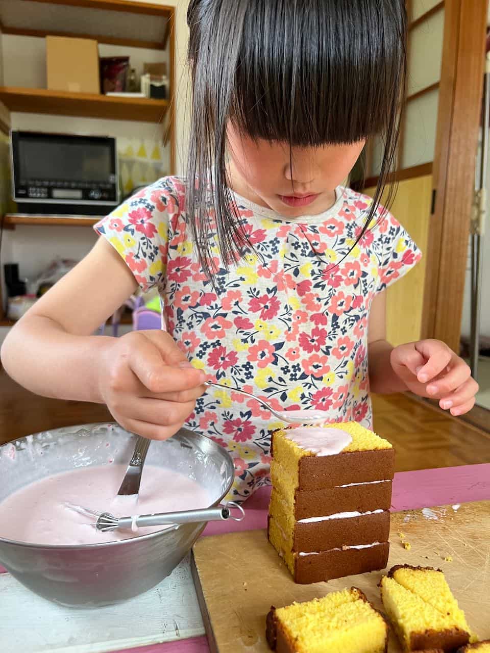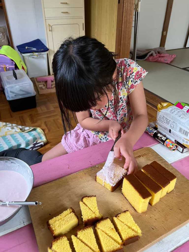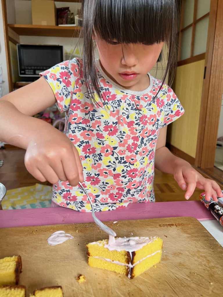 カステラにクリームを塗って、家を組み立てていきます。