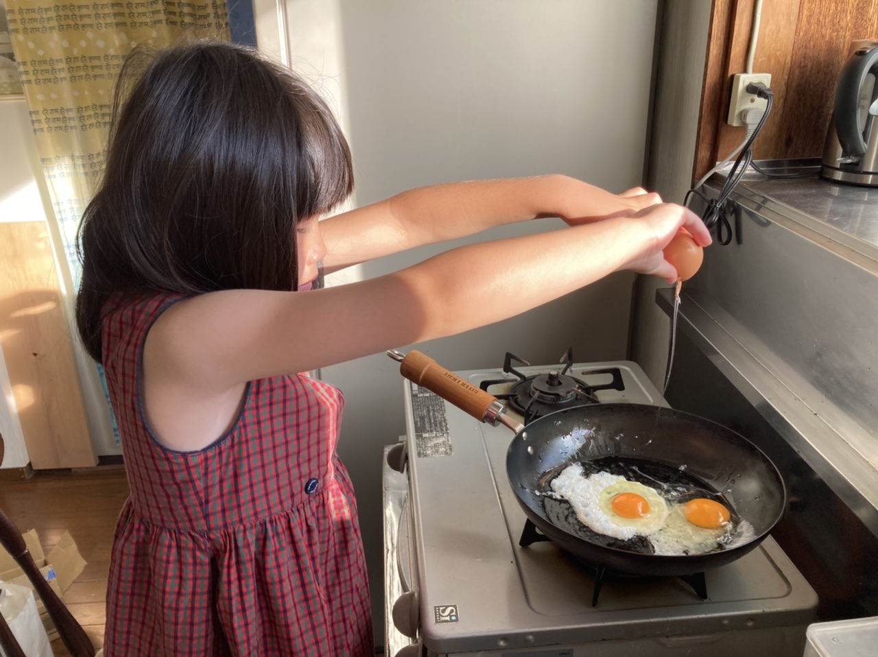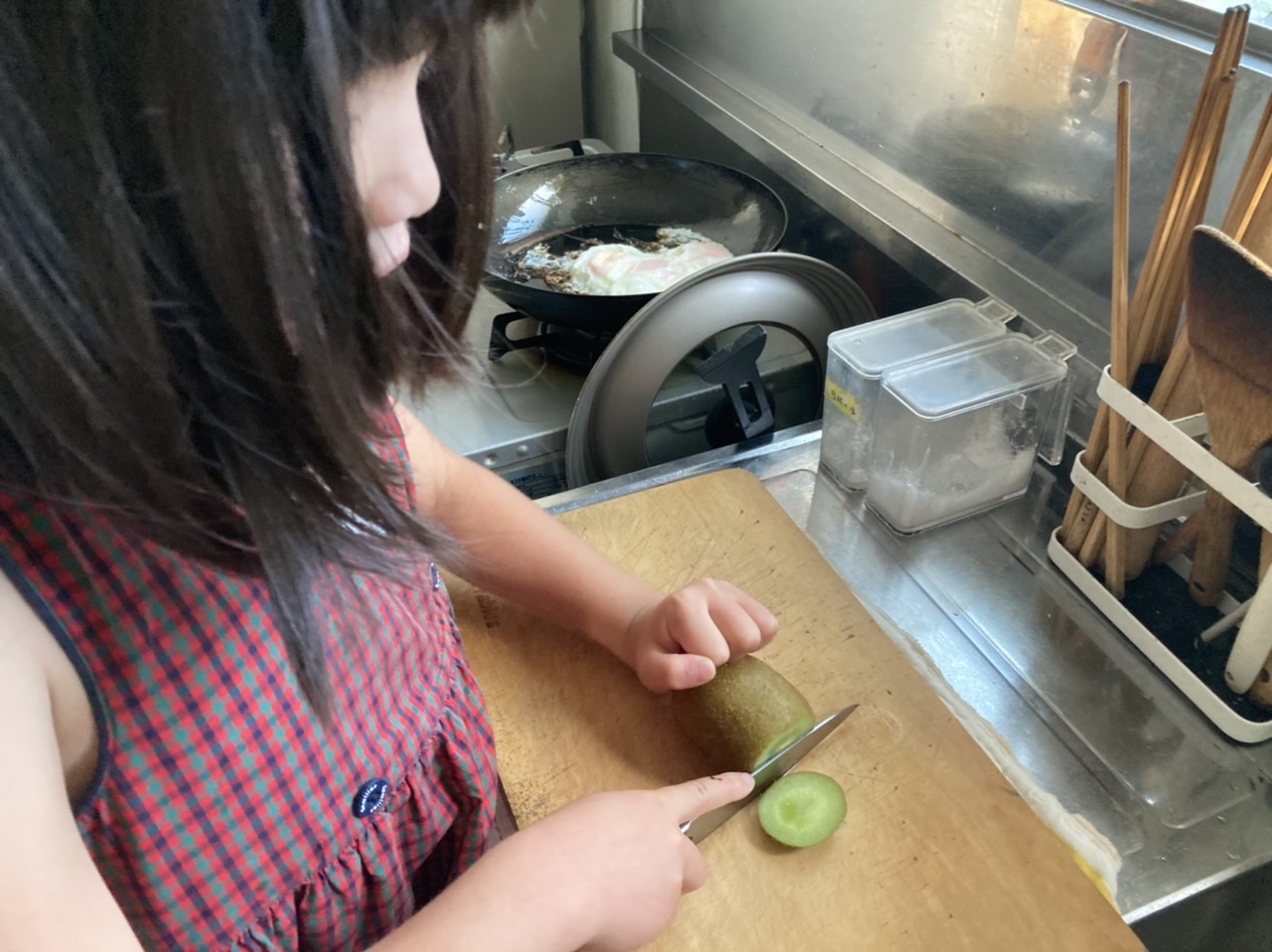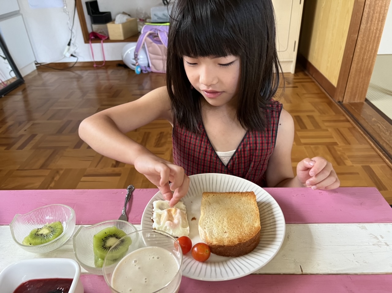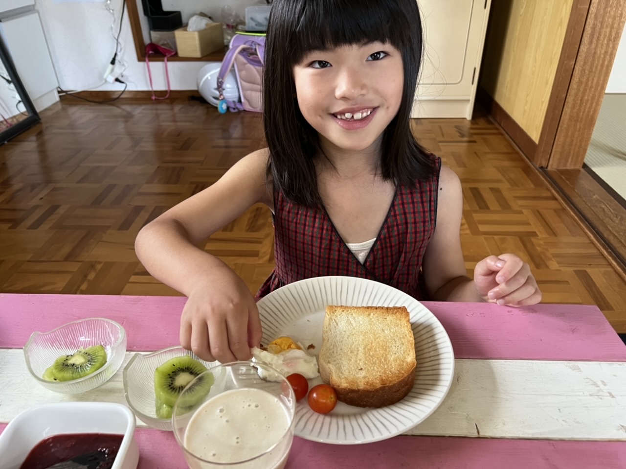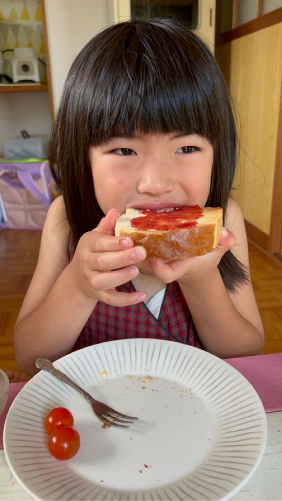 朝食作り めいさん日記 2022.07.032022.07.08 学校で「朝ごはん作ろう」という本を借りてきて、7/2(土)の朝めいさんがごはんを作ってくれました。 目玉焼きを作っています。 キウイの皮を剥いて切っています。 朝食が出来上がりました。メニューはトースト、自家製苺ジャム、目玉焼き、畑のミニトマト、キウイ、バナナと豆乳のスムージーです。「いただきます !」 めいさん、美味しい朝ごはんを作ってくれてありがとう ! コメント