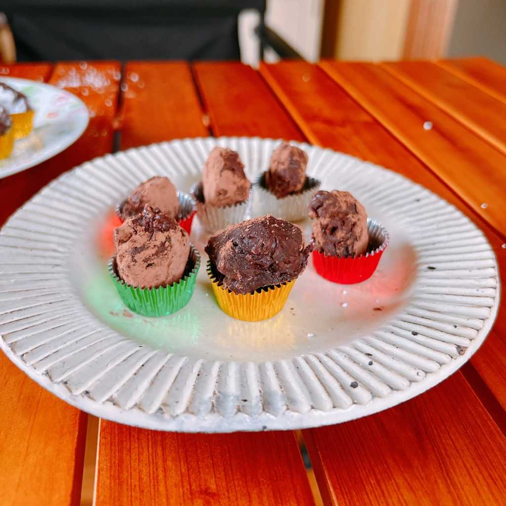 トリュフ作り めいさん日記 2022.07.10 週末恒例のめいさんクッキング。7/9(土) はトリュフ作りに挑戦しました。図書室で借りてきた本を見ながら作っています。まずは板チョコを割ります。 生クリームにバターを溶かしたものを注ぎます。 混ぜ混ぜ。 冷蔵庫で冷やし固めたチョコを丸めます。 ココアと粉砂糖をまぶします。 トリュフカップに詰めます。 出来上がりました ! めいさん、美味しいトリュフを作ってくれてありがとう ! コメント
