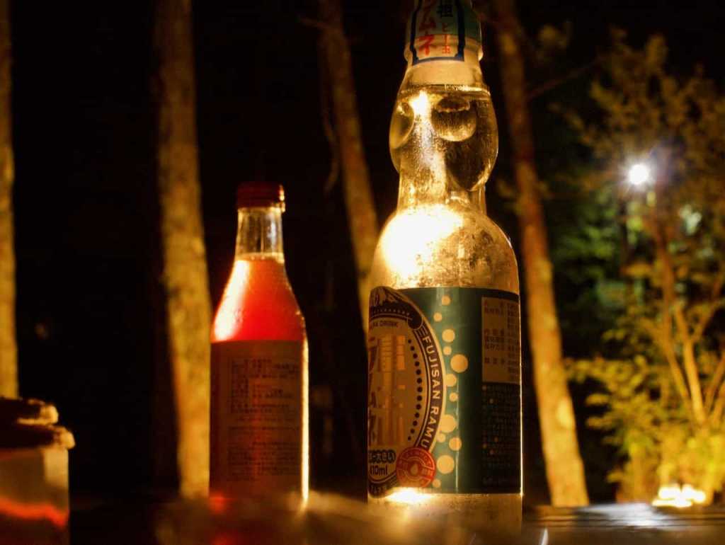 テントに戻り、温泉で買ったサイダーをランタンの光のもと楽しみました。