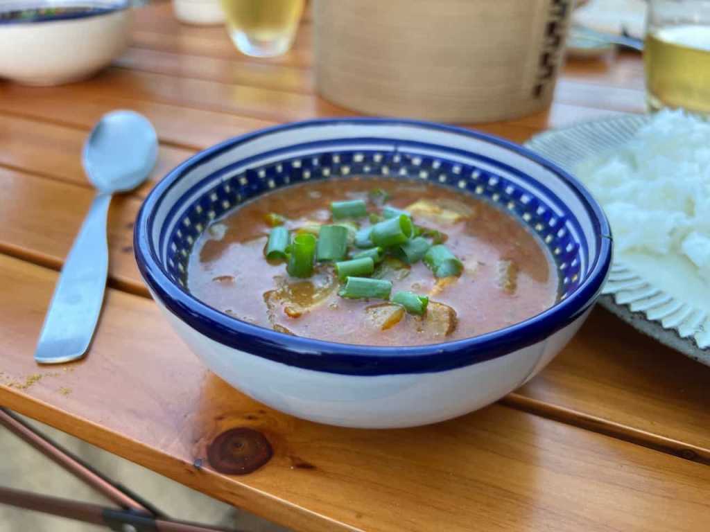 ロケットストーブでカレー めいさん日記 2022.08.27 先日作ったロケットストーブを使って、今度はカレーを楽しみました。 ロケットストーブを作りました。「ロケットストーブ」なるものを葉子ちゃんが以前から作ってみたいと言っていて、ネットで作り方を調べて作ってみました。7/30 ロケットストーブ作り下田市の清掃センターを訪ねてペール缶をいただいてきました。あと、ステンレスの煙突とか、ネジとか、... 今日はレンガを積み、炎が大きくならないようにすることで、直火が鍋を包み込むのを防ぐことに成功しました。 カレーはいつも葉子ちゃんが作ってくれるスパイスたっぷりのおいしいカレー。 カレー大好きなめいさんは、お外も気持ちいいし、いつもの倍くらいのスピードでカレーを食べていきます。 コメント