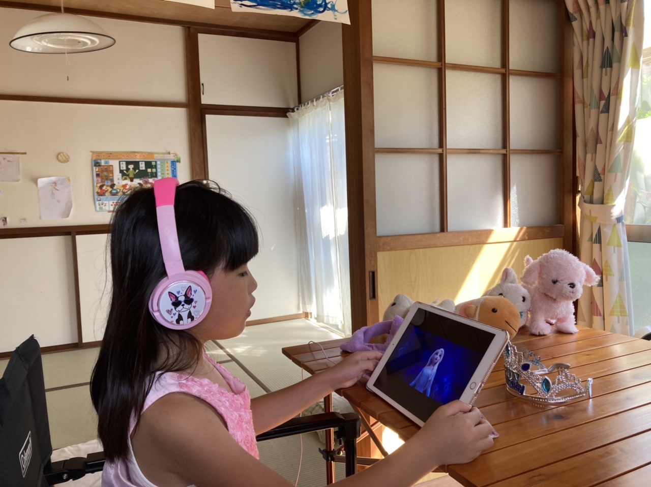 iPad にヘッドフォンをつけて、「アナと雪の女王2」の歌を熱唱しています♪