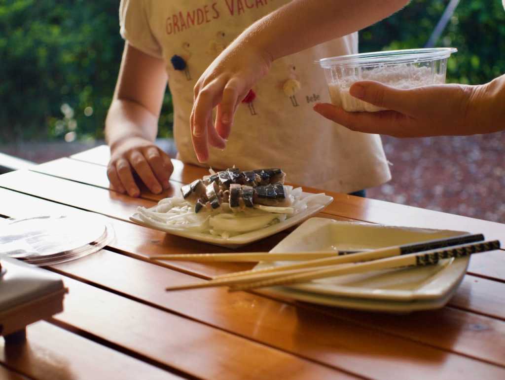めいさんがお塩を振りかけるお手伝いをしています。
