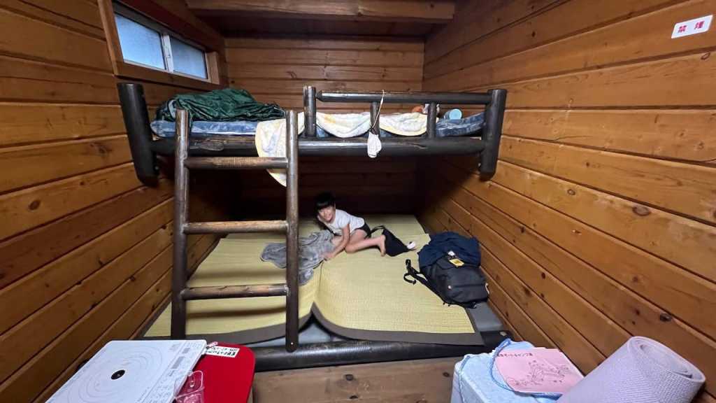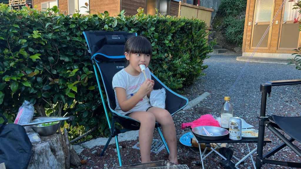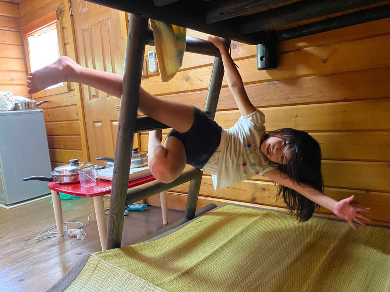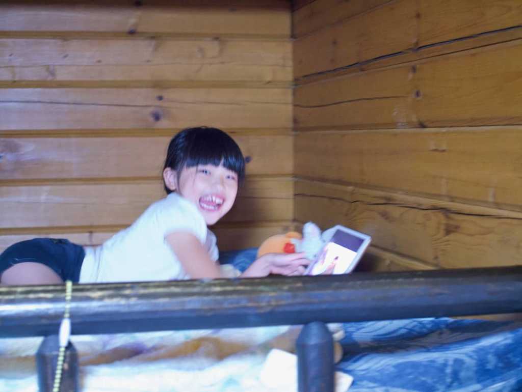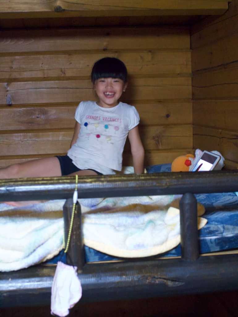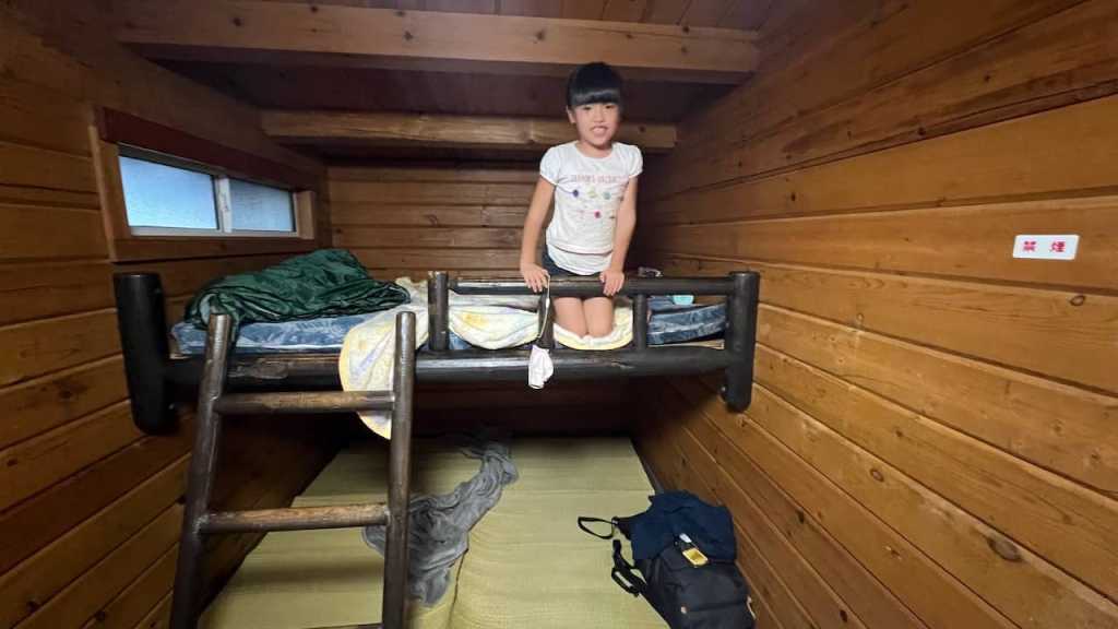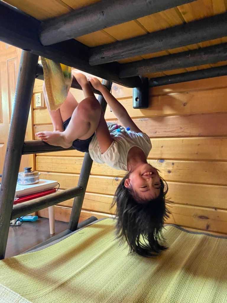 高橋家はテント、中村家はログキャビンの宿泊予約をしていたのですが、めいさんはログキャビンの2段ベッドが気に入ったため、中村家と一緒に泊まらせてもらいました。