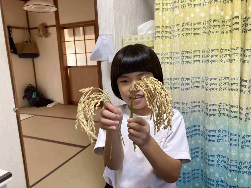 家に帰ってお飾り用の稲穂をめいさんに見せると「お米だー !」と喜んでいました。