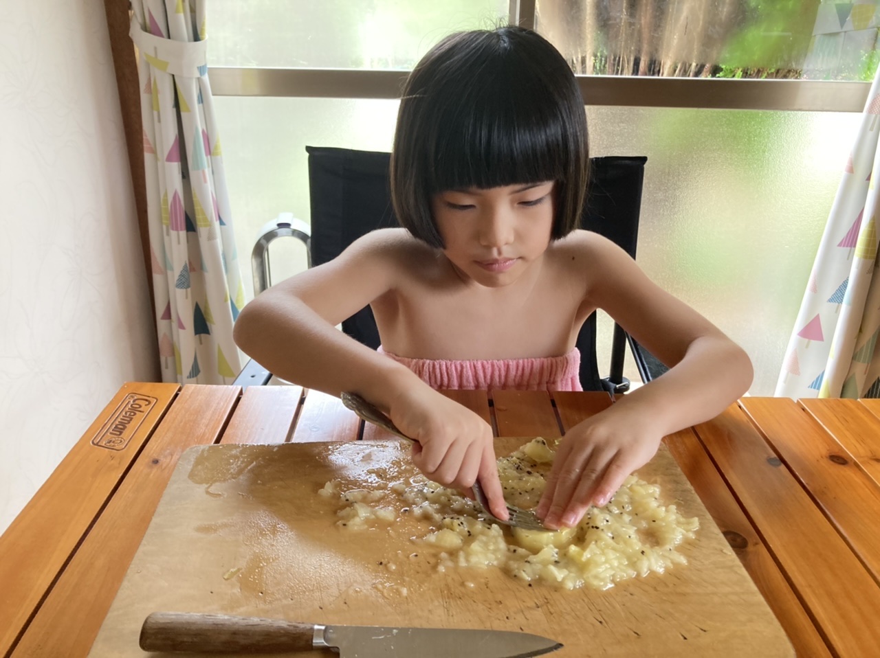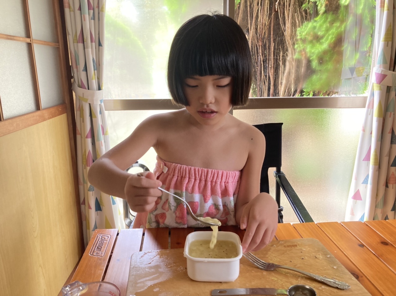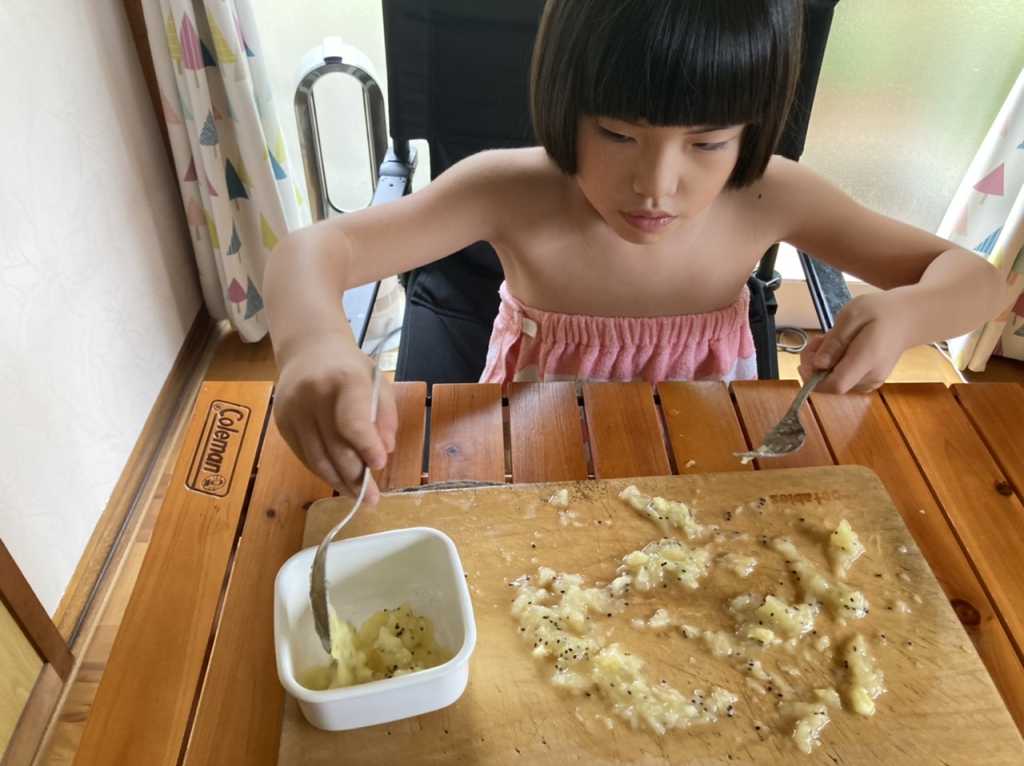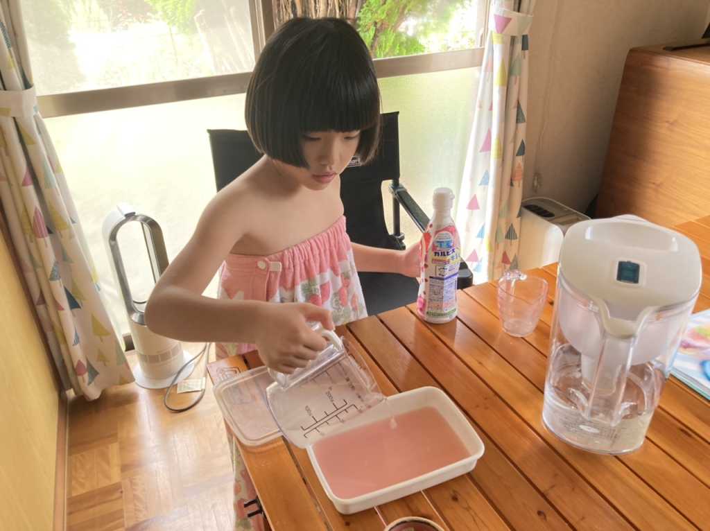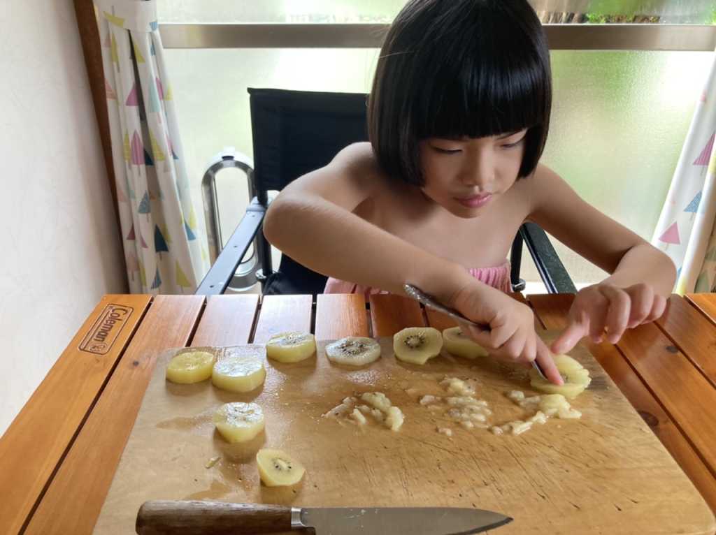 シャーベット作り めいさん日記 2022.09.21 図書室で借りてきたスイーツの本を見ながらシャーベットを作りました。キウイフルーツと苺カルピスの2種類を作りました。初めてキウイの皮を包丁で剥いてみました。まだ少し危なっかしいところもありますが、上手に皮を剥くことができました。 皮を剥いた後はキウイをカットして、フォークの背でキウイを潰していきます。 容器に潰したキウイとお砂糖、お水を入れて混ぜ、冷凍庫で凍らせたら美味しいキウイシャーベットの完成です ! こちらは苺カルピスのシャーベット作り↓ コメント