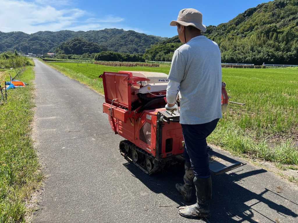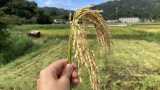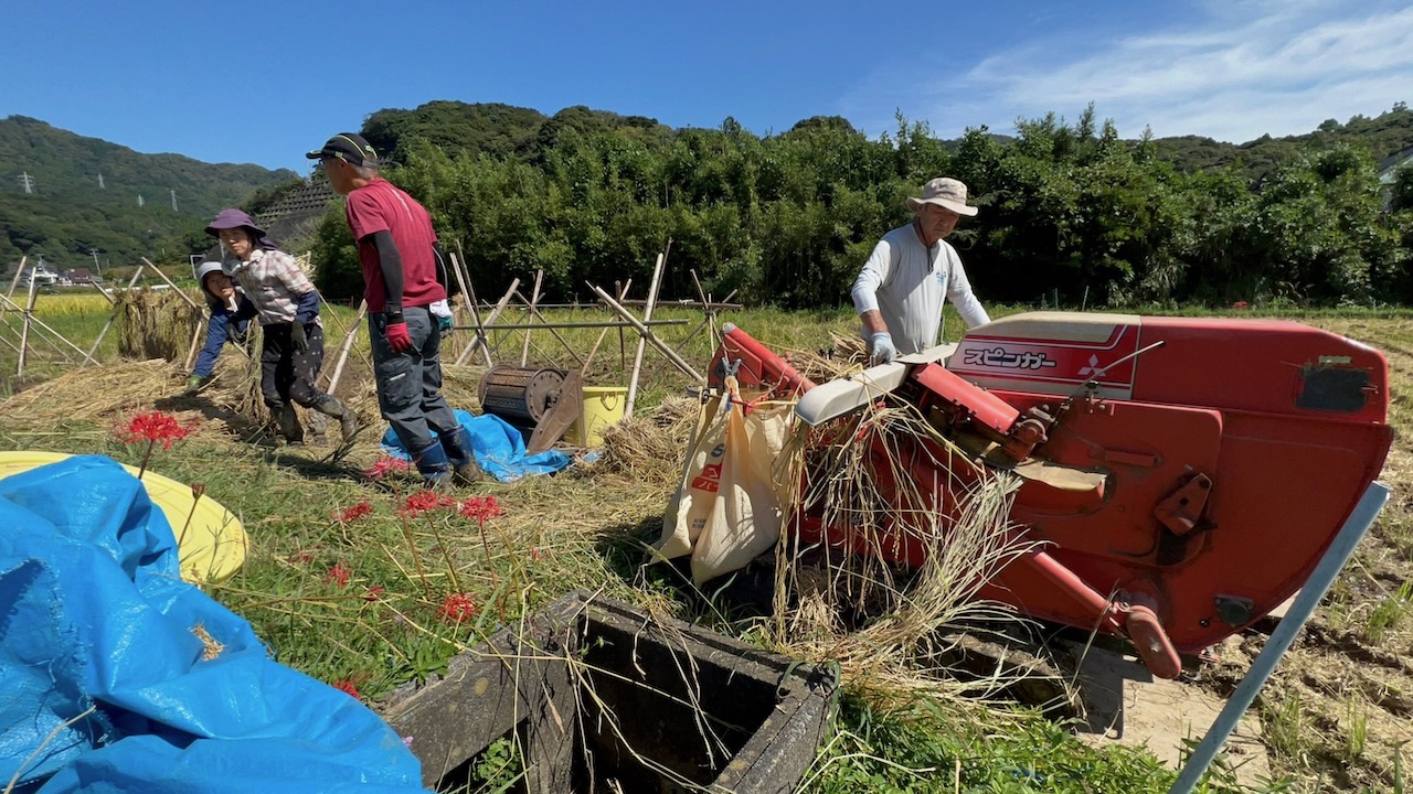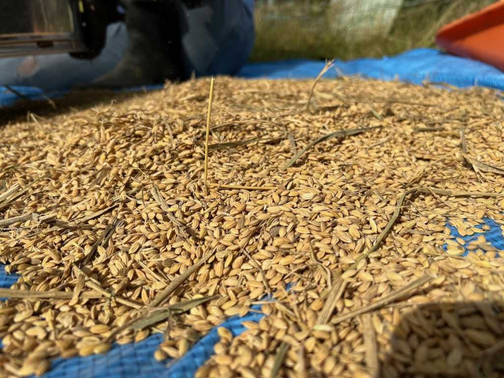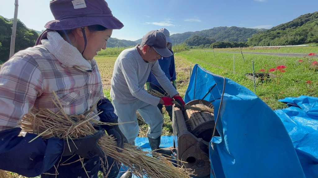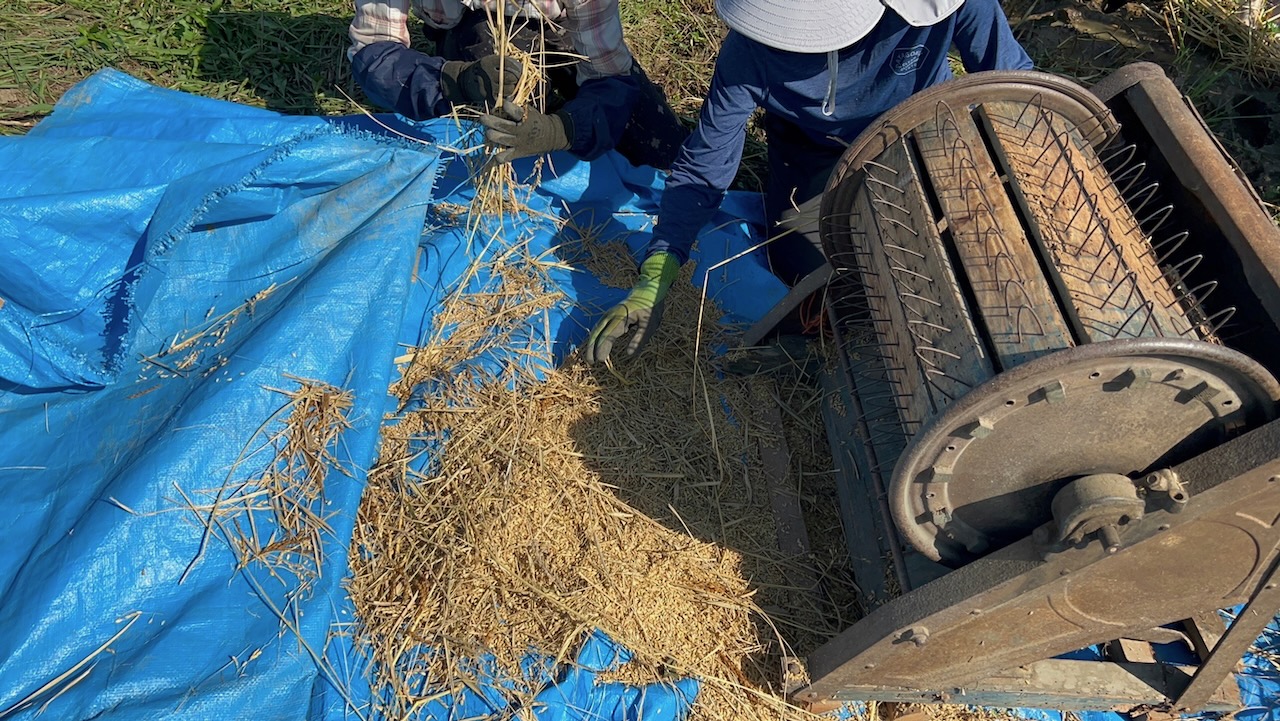 三人でガッタンコ、ガッタンコと頑張っていると、たまたまえいじさんのお知り合いの方が近くの田んぼで脱穀作業をされていて、「よくそんなの(足踏み脱穀機)残っていたね、それで落ちる ? こっちの作業がもう少しで終わるから、終わったらそっちの田んぼもついでにやってあげるよ」と仰ってくださり、残りは機械で脱穀していただくことになりました。