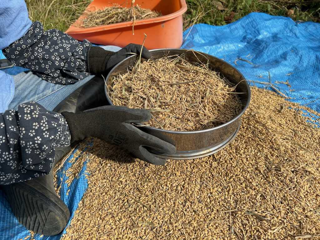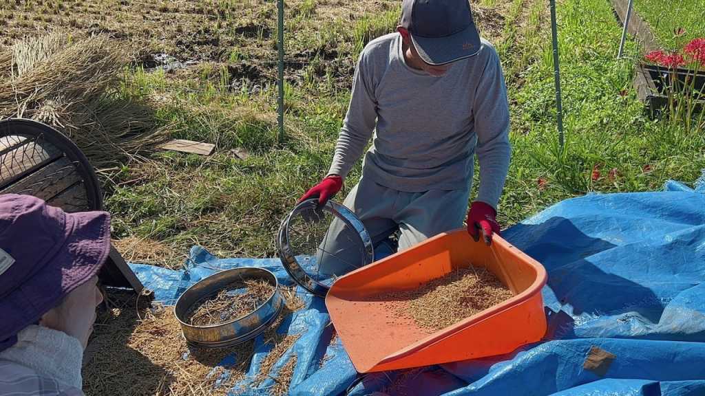 籾と藁が落ちてきるので、藁をざっと取り除きます。