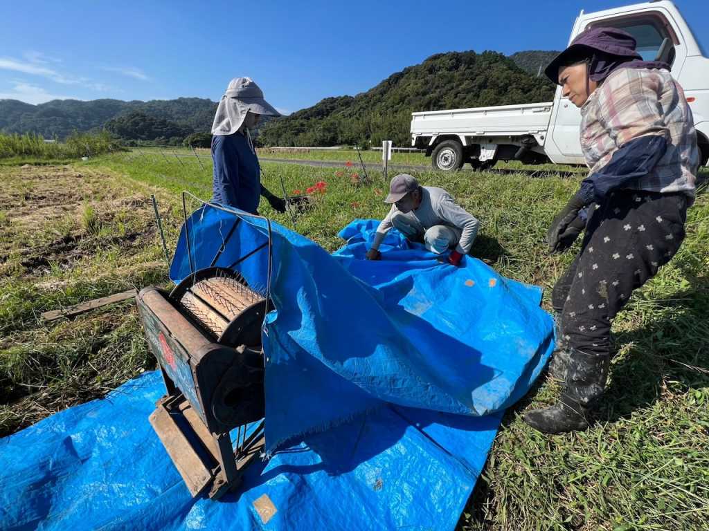 えいじさんはこの後用事があるとのことで、足踏み脱穀機の使い方からふるいのかけ方を教えて下さった後、私たち三人で脱穀作業を進めていきました。