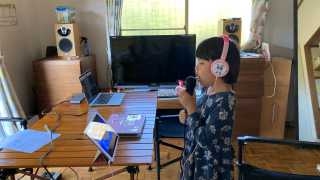 ヘッドフォンをつけてマイクで「アナと雪の女王」を熱唱しています。人生初のカラオケをしたブログはこちら↓