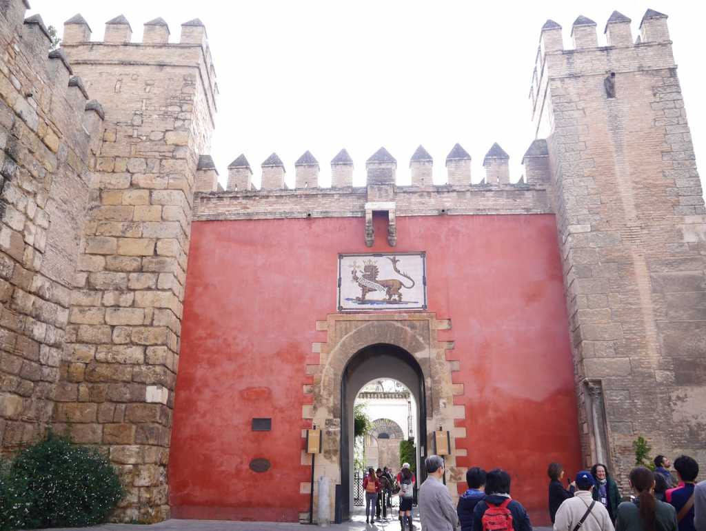 世界遺産・アルカサルを見学しました。カスティーリャ王国ペドロ1世がレコンキスタの後の14世紀に建てた宮殿で、イスラムとキリストの建築様式が融合したムデハル様式の豪華な宮殿です。「ライオンの門」からアルカサルの中へと入ります。