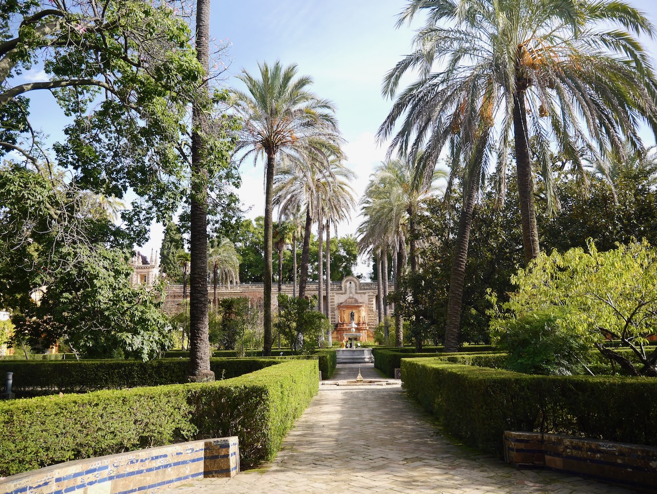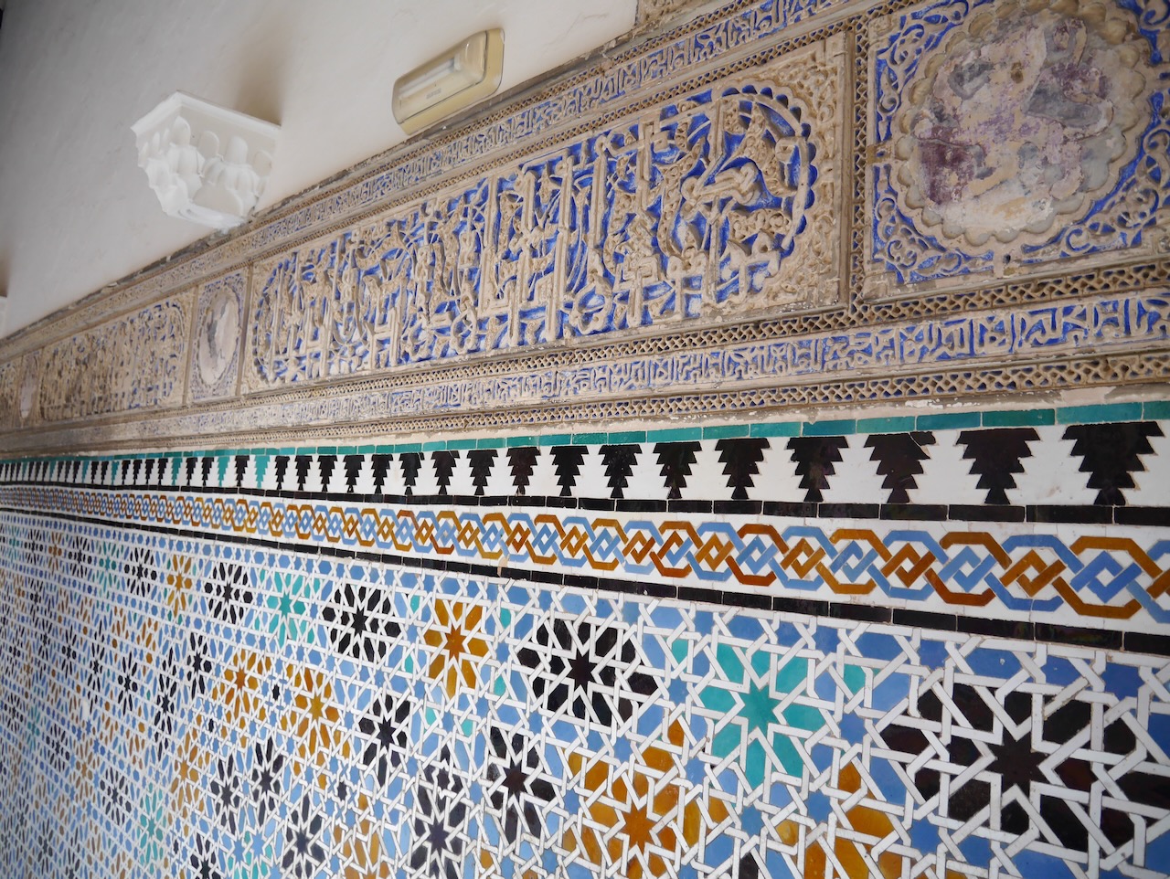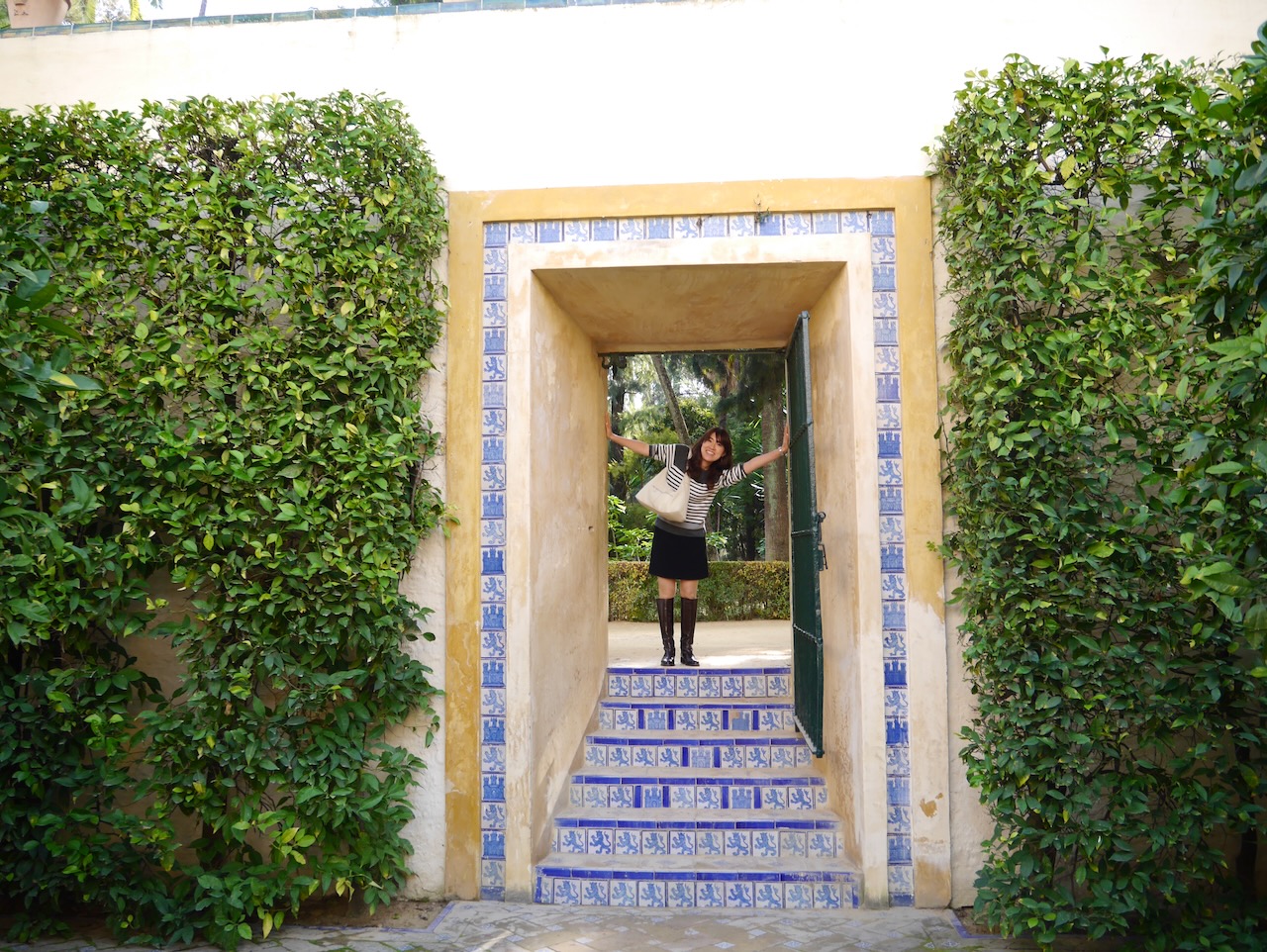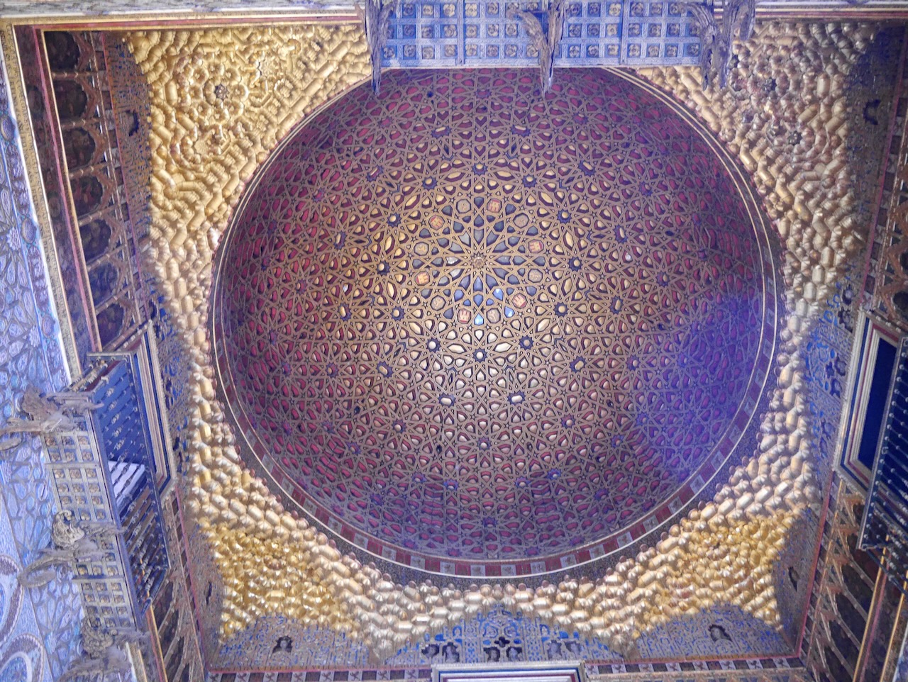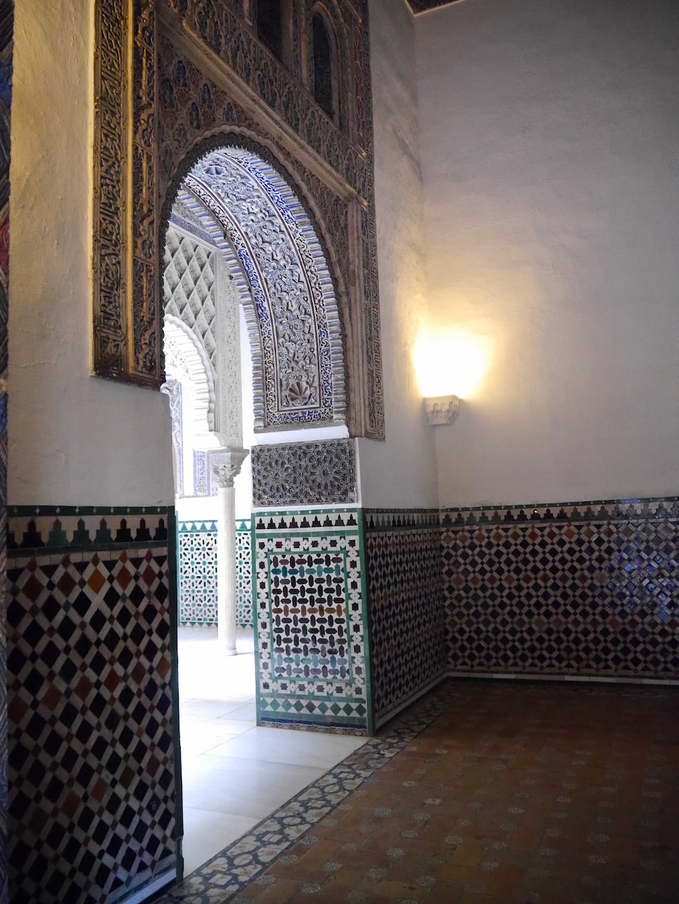 この宮殿を建てたペドロ1世はかなりのイスラム文化好きで、アルハンブラ宮殿のようなイスラム芸術に彩られた宮殿を造るために、スペイン各地から職人を呼び寄せたとか。この乙女の中庭もアルハンブラ宮殿を彷彿とさせるようなつくりになっていました。アラベスク紋様の漆喰細工のアーチも美しい。