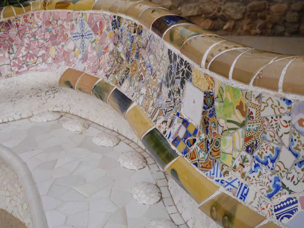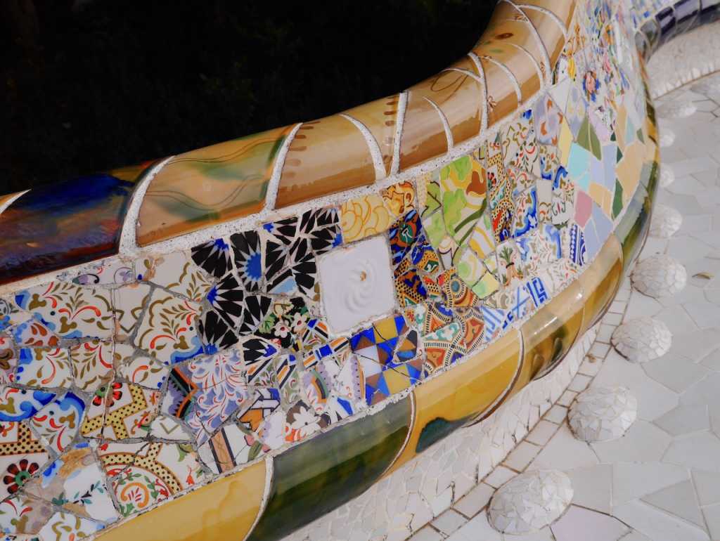 ベンチにはぱっと目を引く美しいモザイク。タイルを一旦細かく砕いた物を建造物の表面に再び装飾として貼り付けたもので、カタルーニャ語で「トレンカディス」(破砕タイルという意味)と言います。